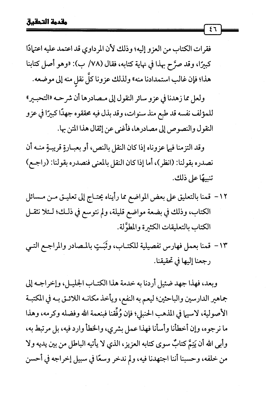فقرات الكتاب من العزو إليه؛ وذلك لأن المرداوي قد اعتمد عليه اعتمادًا كبيرًا، وقد صرَّح بهذا في نهاية كتابه، فقال: "وهو أصل كتابنا هذا؛ فإن غالب استمدادنا منه" ولذلك عزونا كلَّ نقلٍ منه إلى موضعه.