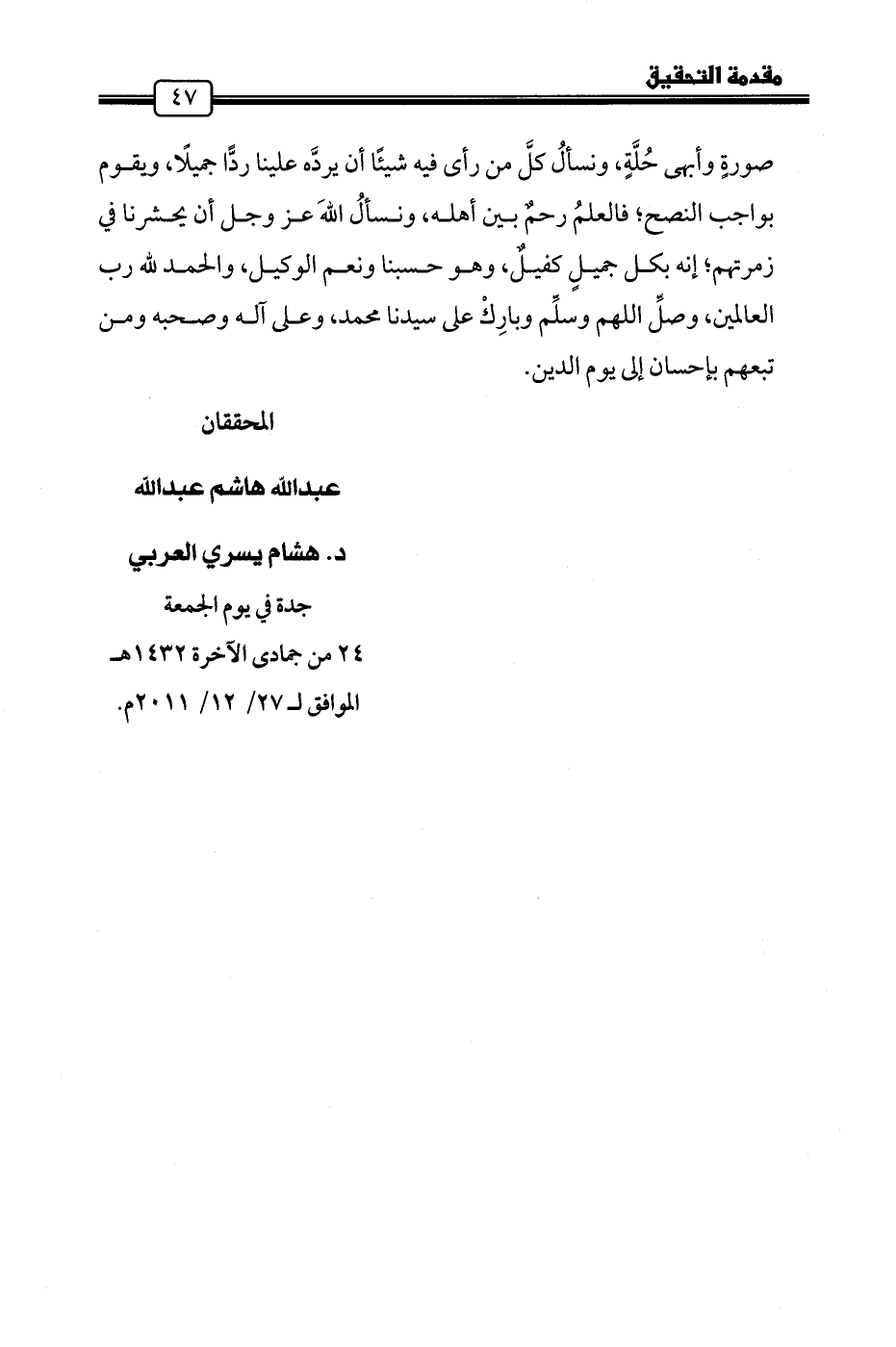 صورةٍ وأبهى حُلَّةٍ، ونسألُ كلَّ من رأى فيه شيئًا أن يردَّه علينا ردًّا جميلًا، ويقوم بواجب النصح؛ فالعلمُ رحمٌ بين أهله، ونسألُ اللَّهَ عز وجل أن يحشرنا في زمرتهم؛ إنه بكل جميلٍ كفيلٌ، وهو حسبنا ونعم الوكيل، والحمد للَّه رب العالمين، وصلِّ اللهم وسلِّم وبارِكْ على سيدنا محمد، وعلى آله وصحبه ومن تبعهم بإحسان إلى يوم الدين.