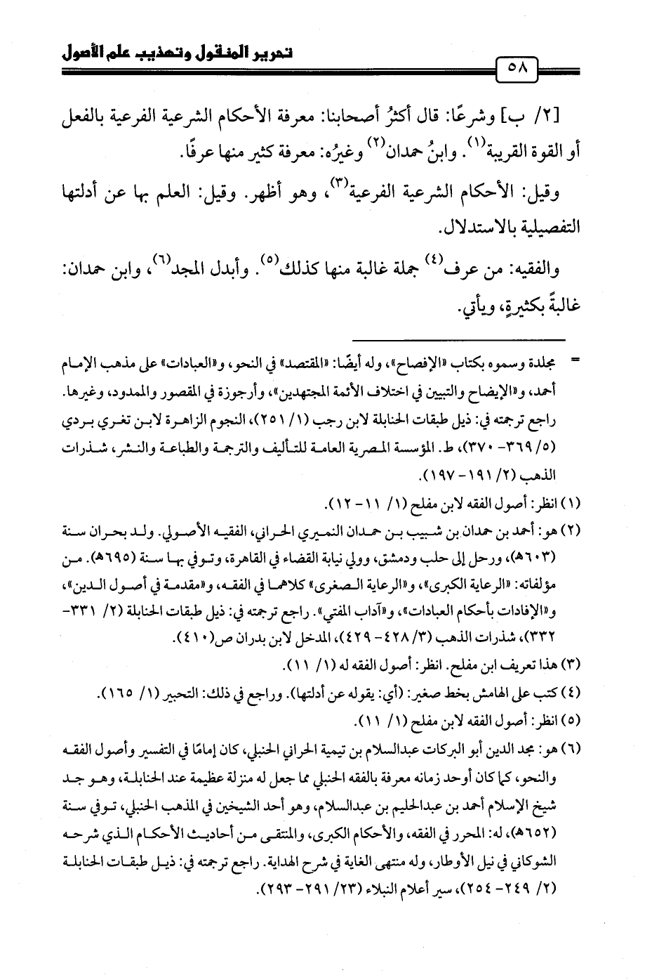 وشرعًا: قال أكثرُ أصحابنا: معرفة الأحكام الشرعية الفرعية بالفعل أو القوة القريبة (١). وابنُ حمدان (٢) وغيرُه: معرفة كثير منها عرفًا.