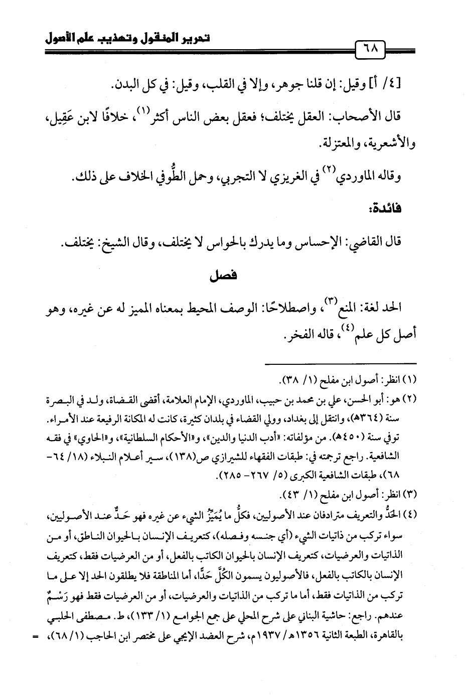 (٤) الحَدُّ والتعريف مترادفان عند الأصوليين، فكلُّ ما يُمَيِّزُ الشيء عن غيره فهو حَدٌّ عند الأصوليين، سواء تركب من ذاتيات الشيء (أي جنسه وفصله)، كتعريف الإنسان بالحيوان الناطق، أو من الذاتيات والعرضيات، كتعريف الأنسان بالحيوان الكاتب بالفعل، أو من العرضيات فقط، كتعريف الإنسان بالكاتب بالفعل، فالأصوليون يسمون الكُلَّ حَدًّا، أما المناطقة فلا يطلقون الحدّ إلا على ما تركب من الذاتيات فقط، أما ما تركب من الذاتيات والعرضيات، أو من العرضيات فقط فهو رَسْمٌ عندهم. راجع: حاشية البناني على شرح المحلي على جمع الجوامع (١/ ١٣٣)، ط. مصطفى الحلبي بالقاهرة، الطبعة الثانية ١٣٥٦ هـ/ ١٩٣٧ م، شرح العضد الإيجي على مختصر ابن الحاجب (١/ ٦٨)، =