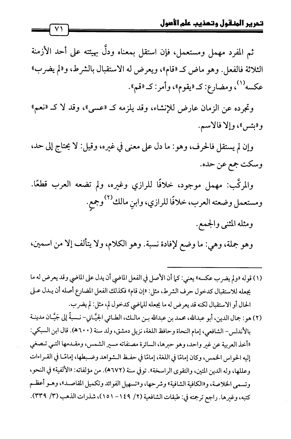 ثم المفرد مهمل ومستعمل، فإن استقل بمعناه ودلَّ بهيئته على أحد الأزمنة الثلاثة فالفعل. وهو ماض كـ"قام"، ويعرض له الاستقبال بالشرط، و"لم يضرب" عكسه (١)، ومضارع: كـ "يقوم"، وأمر: كـ "قم".