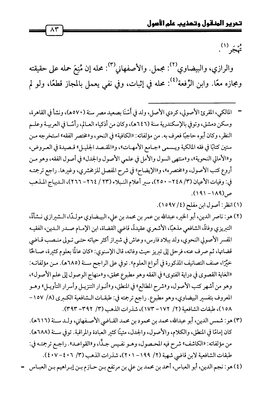 والرازي، والبيضاوي (٢): مجمل. والأصفهاني (٣): محله إن مُنِعَ حمله على حقيقته ومجازه معًا. وابن الرِّفعة (٤): محله في إثبات، وفي نفي يعمل بالمجاز قطعًا، ولو لم