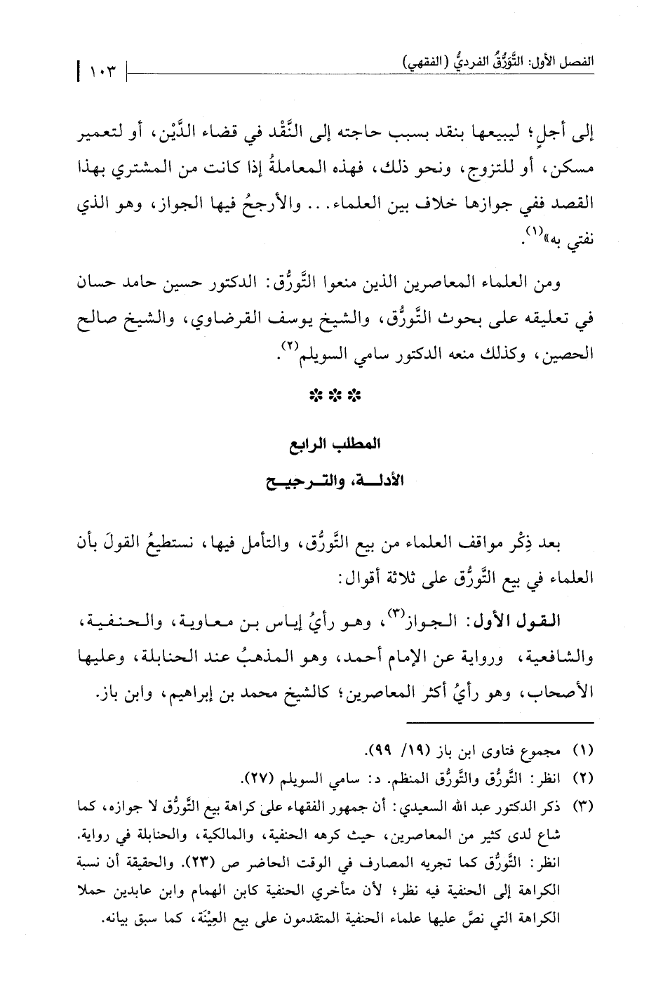 (¬3) ذكر الدكتور عبد الله السعيدي: أن جمهور الفقهاء على كراهة بيع التَّورُّق لا جوازه، كما شاع لدى كثير من المعاصرين، حيث كرهه الحنفية، والمالكية، والحنابلة في رواية. انظر: التَّورُّق كما تجريه المصارف في الوقت الحاضر ص (23). والحقيقة أن نسبة الكراهة إلى الحنفية فيه نظر؛ لأن متأخري الحنفية كابن الهمام وابن عابدين حملا الكراهة التي نصَّ عليها علماء الحنفية المتقدمون على بيع العِيْنَة، كما سبق بيانه.