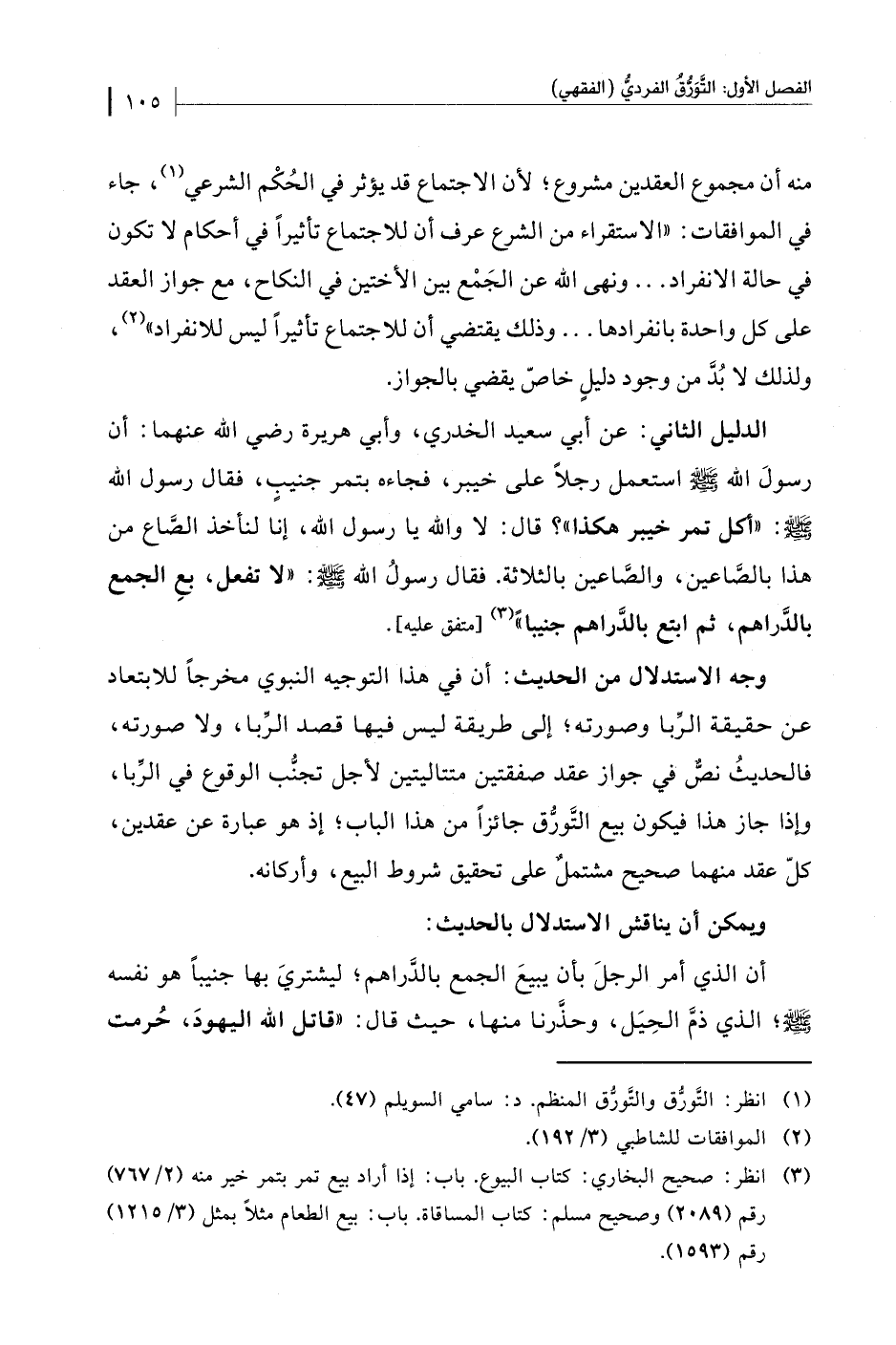 الدليل الثاني: عن أبي سعيد الخدري، وأبي هريرة رضي الله عنهما: أن رسولَ الله - صلى الله عليه وسلم - استعمل رجلًا على خيبر، فجاءه بتمر جنيبٍ، فقال رسول الله - صلى الله عليه وسلم -: "أكل تمر خيبر هكذا"؟ قال: لا والله يا رسول الله، إنا لنأخذ الصَّاع من هذا بالصَّاعين، والصَّاعين بالثلاثة. فقال رسولُ الله - صلى الله عليه وسلم -: "لا تفعل، بعِ الجمع بالدَّراهم، ثم ابتع بالدَّراهم جنيبًا" (¬3) [متفق عليه].