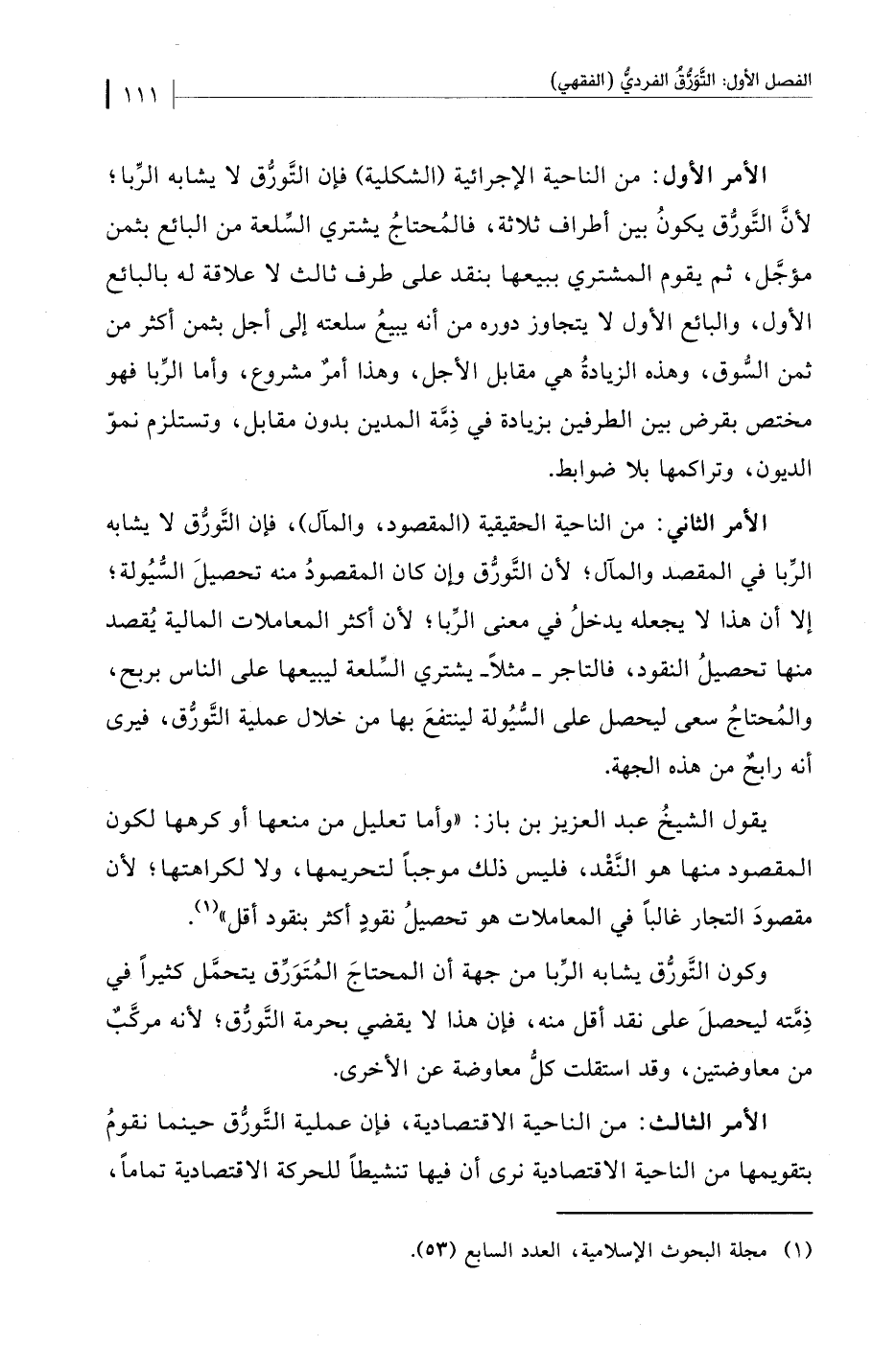 الأمر الأول: من الناحية الإجرائية (الشكلية) فإن التَّورُّق لا يشابه الرِّبا؛ لأنَّ التَّورُّق يكونُ بين أطراف ثلاثة، فالمُحتاجُ يشتري السِّلعة من البائع بثمن مؤجَّل، ثم يقوم المشتري ببيعها بنقد على طرف ثالث لا علاقة له بالبائع الأول، والبائع الأول لا يتجاوز دوره من أنه يبيعُ سلعته إلى أجل بثمن أكثر من ثمن السُّوق، وهذه الزيادةُ هي مقابل الأجل، وهذا أمرٌ مشروع، وأما الرِّبا فهو مختص بقرض بين الطرفين بزيادة في ذِمَّة المدين بدون مقابل، وتستلزم نموّ الديون، وتراكمها بلا ضوابط.