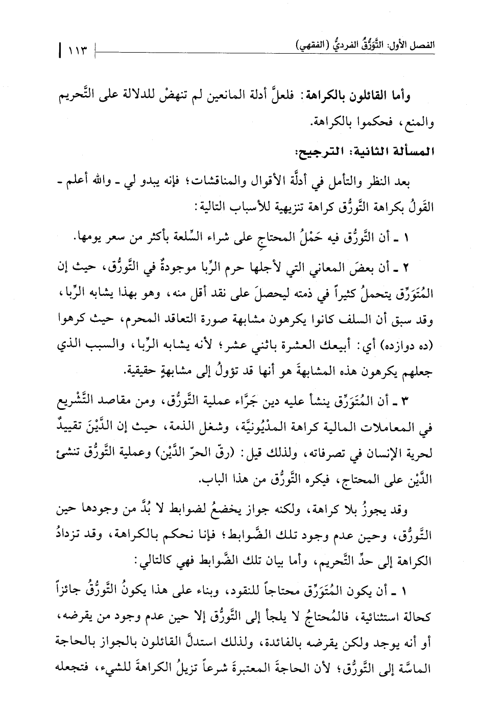 1 - أن يكون المُتَوَرِّق محتاجًا للنقود، وبناء على هذا يكونُ التَّورُّقُ جائزًا كحالة استثنائية، فالمُحتاجُ لا يلجأ إلى التَّورُّق إلا حين عدم وجود من يقرضه، أو أنه يوجد ولكن يقرضه بالفائدة، ولذلك استدلَّ القائلون بالجواز بالحاجة الماسَّة إلى التَّورُّق؛ لأن الحاجةَ المعتبرةَ شرعًا تزيلُ الكراهةَ للشيء، فتجعله