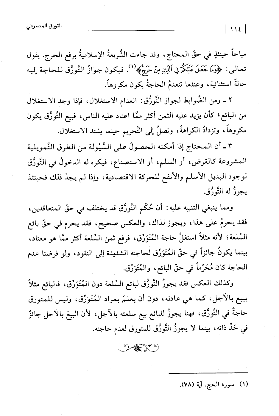 مباحًا حينئذٍ في حقّ المحتاج، وقد جاءت الشَّريعةُ الإسلاميةُ برفع الحرج. يقول تعالى: {وَمَا جَعَلَ عَلَيْكُمْ فِي الدِّينِ مِنْ حَرَجٍ} (¬1). فيكون جوازُ التَّورُّق للحاجة إليه حالةً استثنائية، وعندما تنعدمُ الحاجةُ يكون مكروهًا.