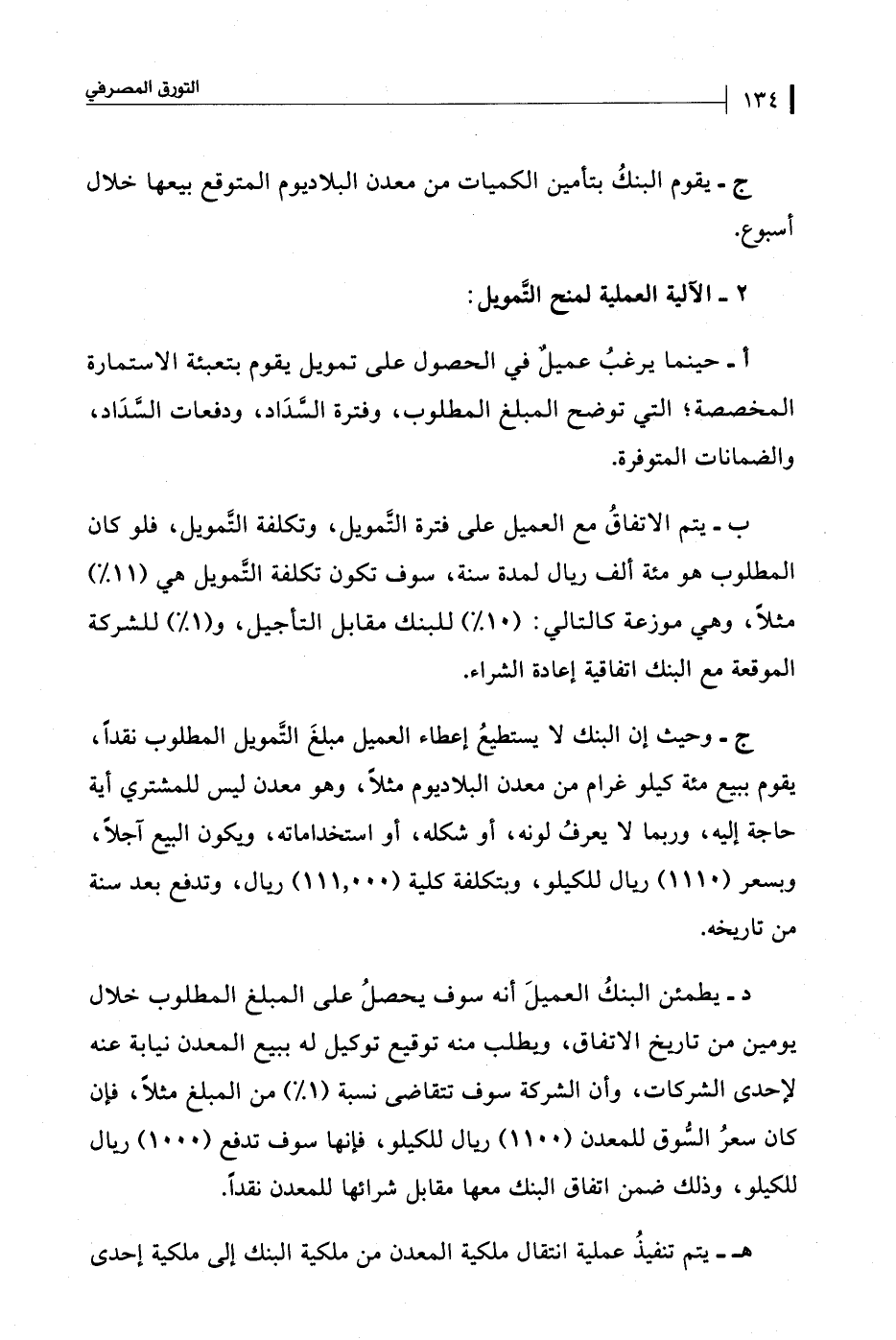 ج- وحيث إن البنك لا يستطيعُ إعطاء العميل مبلغَ التَّمويل المطلوب نقدًا، يقوم ببيع مئة كيلو غرام من معدن البلاديوم مثلًا، وهو معدن ليس للمشتري أية حاجة إليه، وربما لا يعرفُ لونه، أو شكله، أو استخداماته، ويكون البيع آجلًا، وبسعر (1110) ريال للكيلو، وبتكلفة كلية (111.000) ريال، وتدفع بعد سنة من تاريخه.