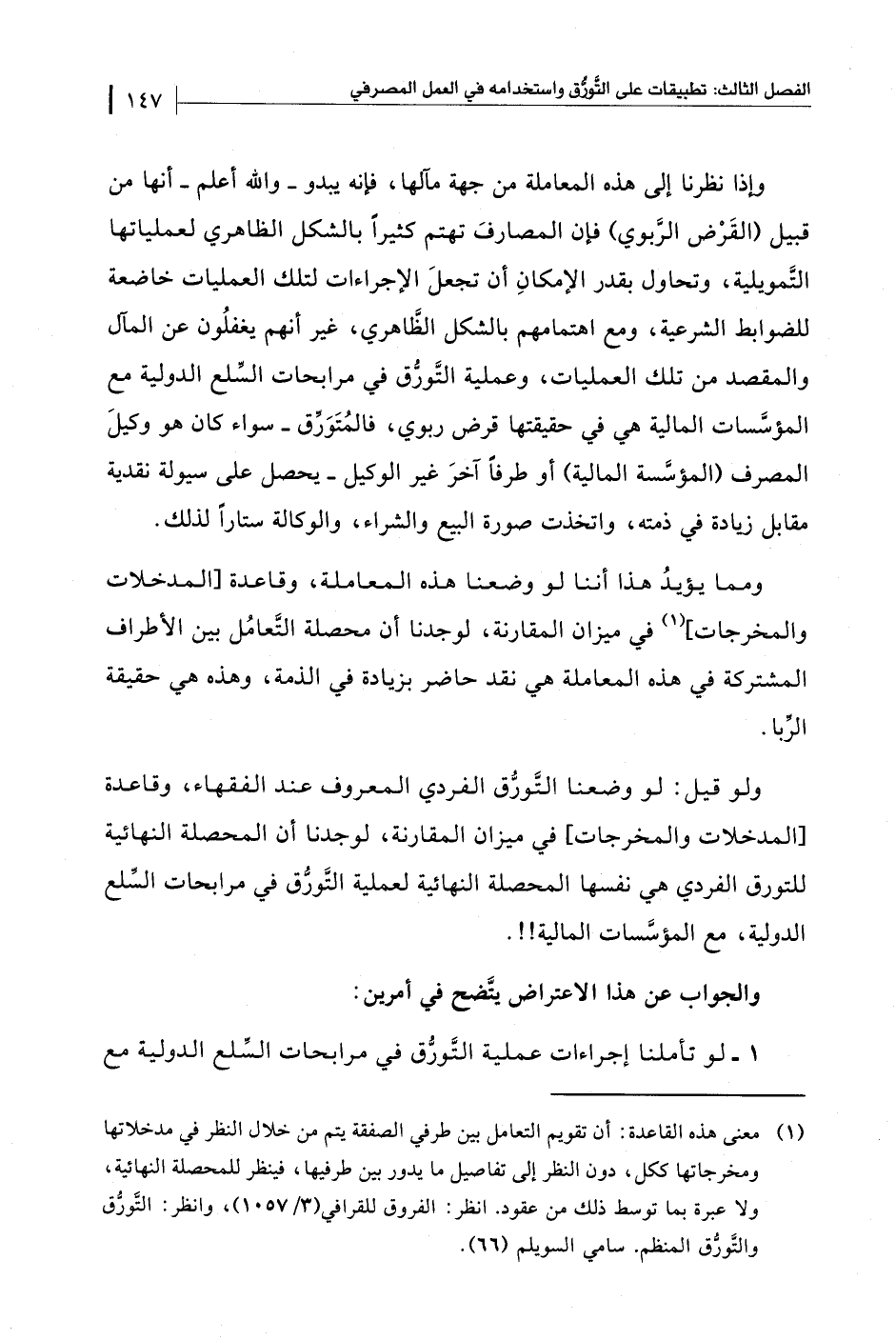 ومما يؤيدُ هذا أننا لو وضعنا هذه المعاملة، وقاعدة [المدخلات والمخرجات] (¬1) في ميزان المقارنة، لوجدنا أن محصلة التَّعامُل بين الأطراف المشتركة في هذه المعاملة هي نقد حاضر بزيادة في الذمة، وهذه هي حقيقة الرِّبا.