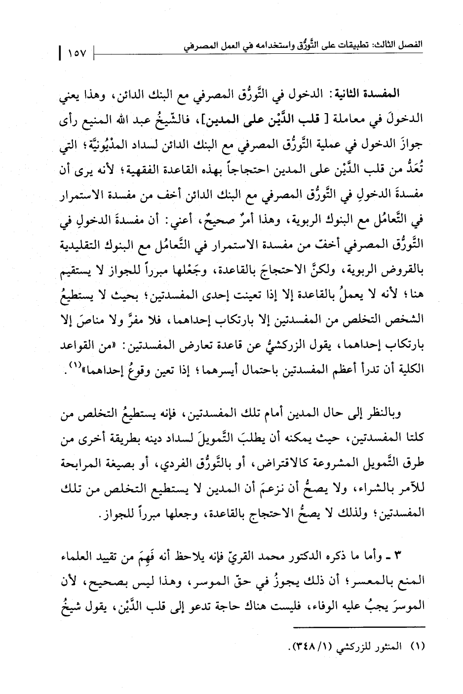 المفسدة الثانية: الدخول في التَّورُّق المصرفي مع البنك الدائن، وهذا يعني الدخولَ في معاملة [قلب الدَّيْن على المدين]، فالشّيخُ عبد الله المنيع رأى جوازَ الدخول في عملية التَّورُّق المصرفي مع البنك الدائن لسداد المديُونيَّة، التي تُعَدُّ من قلب الدَّيْن على المدين احتجاجًا بهذه القاعدة الفقهية؛ لأنه يرى أن مفسدةَ الدخولِ في التَّورُّق المصرفي مع البنك الدائن أخف من مفسدة الاستمرار في التَّعامُل مع البنوك الربوية، وهذا أمرٌ صحيحٌ، أعني: أن مفسدةَ الدخولِ في التَّورُّق المصرفي أخفّ من مفسدة الاستمرار في التَّعامُل مع البنوك التقليدية بالقروض الربوية، ولكنَّ الاحتجاجَ بالقاعدة، وجَعْلها مبررًا للجواز لا يستقيم هنا؛ لأنه لا يعملُ بالقاعدة إلا إذا تعينت إحدى المفسدتين، بحيث لا يستطيعُ الشخص التخلص من المفسدنين إلا بارتكاب إحداهما، فلا مفرَّ ولا مناصَ إلا