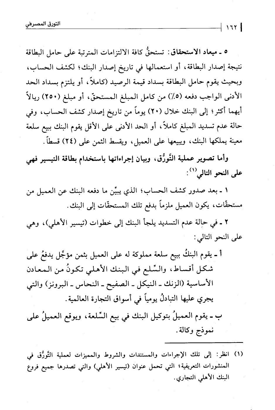 5 - ميعاد الاستحقاق: تستحقُّ كافة الالتزامات المترتبة على حامل البطاقة نتيجة إصدار البطاقة، أو استعمالها في تاريخ إصدار البنك، لكشف الحساب، وبحيث يقوم حامل البطاقة بسداد قيمة الرصيد (كاملًا، أو يلتزم بسداد الحد الأدنى الواجب دفعه (5 %) من كامل المبلغ المستحق، أو مبلغ (250) ريالًا أيهما أكثر، إلى البنك خلال (20) يومًا من تاريخ إصدار كشف الحساب، وفي حالة عدم تسديد المبلغ كاملًا، أوالحد الأدنى على الأقل يقوم البنك ببيع سِّلعة معينة يملكها البنك، ويبيعها على العميل، ويقسط الثمن على (24) قسطًا.