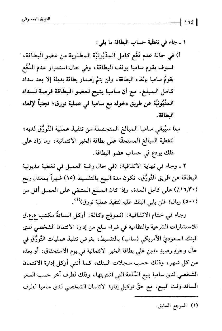 2 - وجاء في نهاية الاتفاقية: (في حال رغبة العميل في تغطية مديونية البطاقة عن طريق التَّورُّق، تكون مدة البيع بالتقسيط (15) شهرًا بمعدل ربح (16.30 %) على كامل المدة، وإذا كان المبلغ المتبقي على العميل أقل من (500) ريال، فلن يلبي البنك طلبه لتنفيذ عملية تَّورُّق) (¬1).