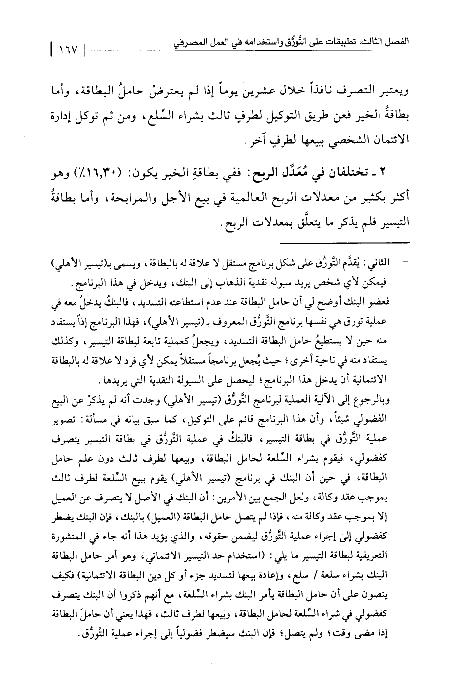 فعضو البنك أوضح لي أن حامل البطاقة عند عدم استطاعته التسديد، فالبنكُ يدخلُ معه في عملية تَّورُّق هي نفسها برنامج التَّورُّق المعروف بـ (تيسير الأهلي)، فهذا البرنامج إذًا يستفاد منه حين لا يستطيعُ حامل البطاقة التسديد، ويجعلُ كعملية تابعة لبطاقة التيسير، وكذلك يستفاد منه في ناحية أخرى، حيث يُجعل برنامجًا مستقلًا يمكن لأي فرد لا علاقة له بالبطاقة الائتمانية أن يدخل هذا البرنامج، ليحصل على السيولة النقدية التي يريدها.