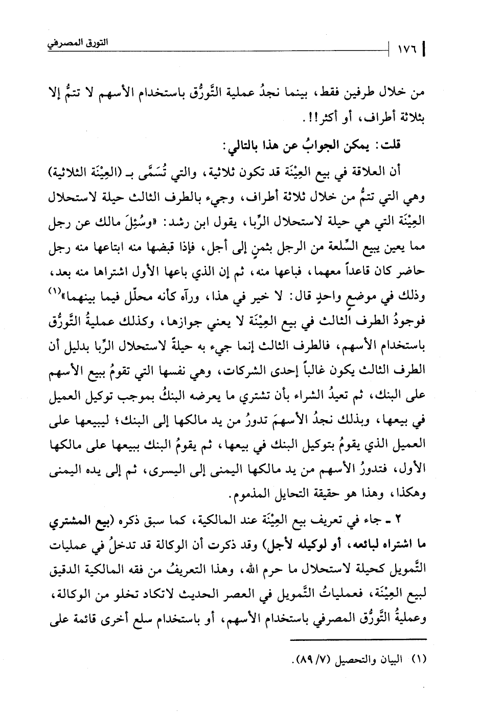 من خلال طرفين فقط، بينما نجدُ عملية التَّورُّق باستخدام الأسهم لا تتمُّ إلا بثلاثة أطراف، أو أكثر!!.