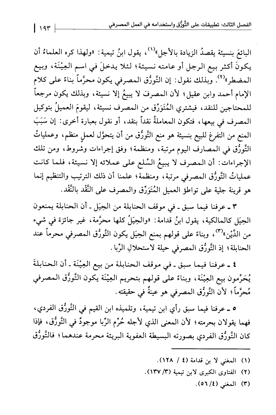 3 - عرفنا فيما سبق -في موقف الحنابلة من الحِيَل- أن الحنابلة يمنعون الحِيَل كالمالكية، يقول ابنُ قدامة: "والحِيَلُ كلها محرَّمة، غير جائزة في شيء من الدَّيْن" (¬3)، وبناءً على قولهم بمنع الحِيَل يكون التَّورُّق المصرفي محرمًا عند الحنابلة، إذ التَّورُّق المصرفي حيلة لاستحلالِ الرِّبا.