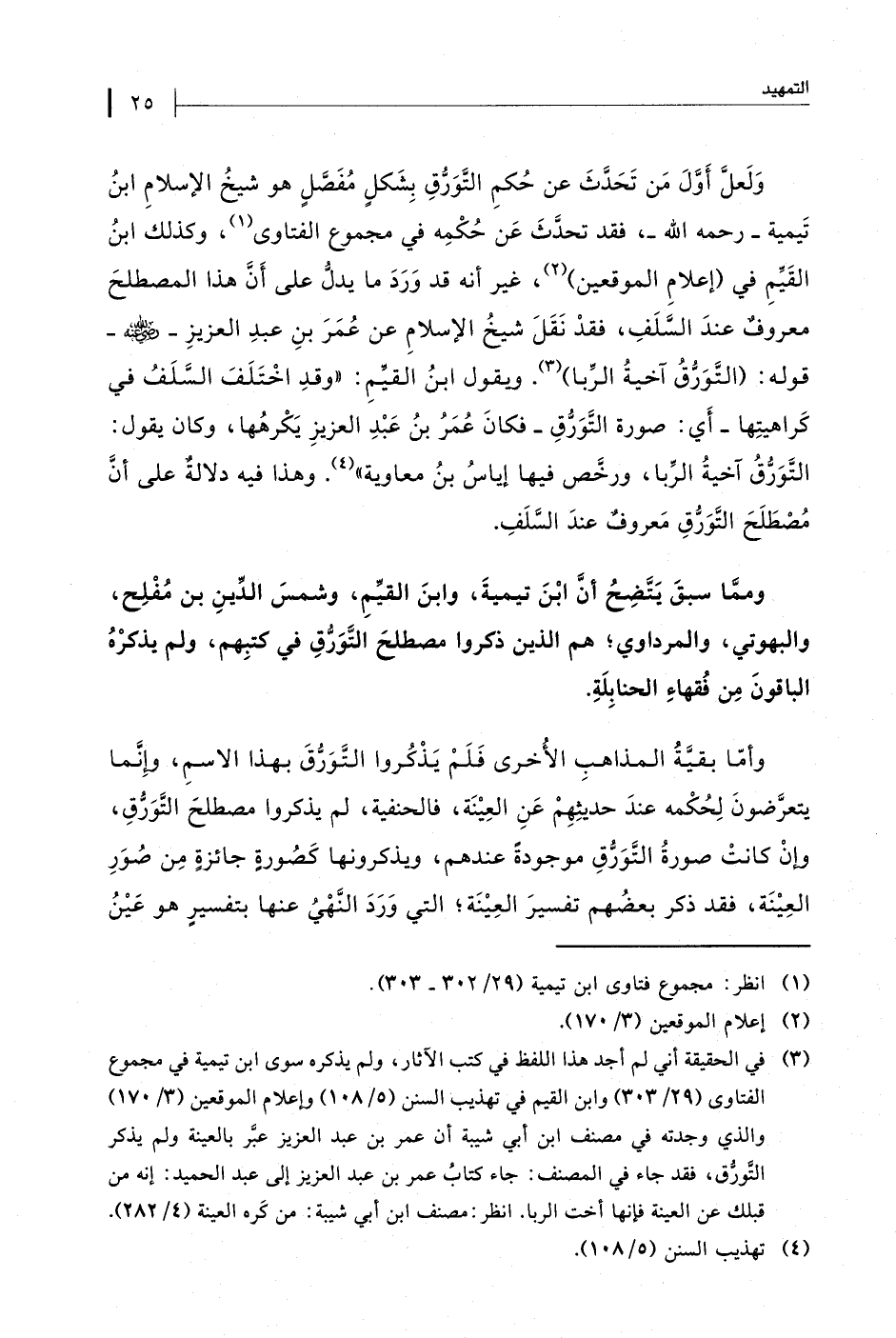 (¬3) في الحقيقة أني لم أجد هذا اللفظ في كتب الآثار، ولم يذكره سوى ابن تيمية في مجموع الفتاوى (29/ 303) وابن القيم في تهذيب السنن (5/ 108) وإعلام الموقعين (3/ 170) والذي وجدته في مصنف ابن أبي شيبة أن عمر بن عبد العزيز عبَّر بالعينة ولم يذكر التَّورُّق، فقد جاء في المصنف: جاء كتابُ عمر بن عبد العزيز إلى عبد الحميد: إنه من قبلك عن العينة فإنها أخت الربا. انظر: مصنف ابن أبي شيبة: من كَره العينة (4/ 282).