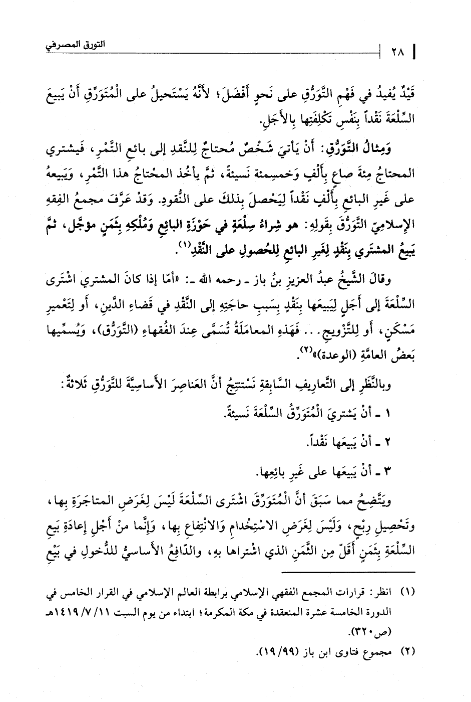 وقالَ الشَّيخُ عبدُ العزيزِ بنُ باز -رحمه الله-: "أمّا إذا كانَ المشتري اشْتَرى السِّلْعَةَ إلى أَجَلٍ لِيَبيعَها بِنَقْدٍ بِسَببِ حاجَتِهِ إلى النَّقْدِ في قَضاءِ الدَّينِ، أَو لِتَعْميرِ مَسْكَنٍ، أَو لِلتَّزْويجِ. . فَهَذهِ المعامَلَةُ تُسَمَّى عِندَ الفُقهاءِ (التَّوَرُّق)، وَيُسمِّيها بَعضُ العامَّةِ (الوعدة) " (¬2).