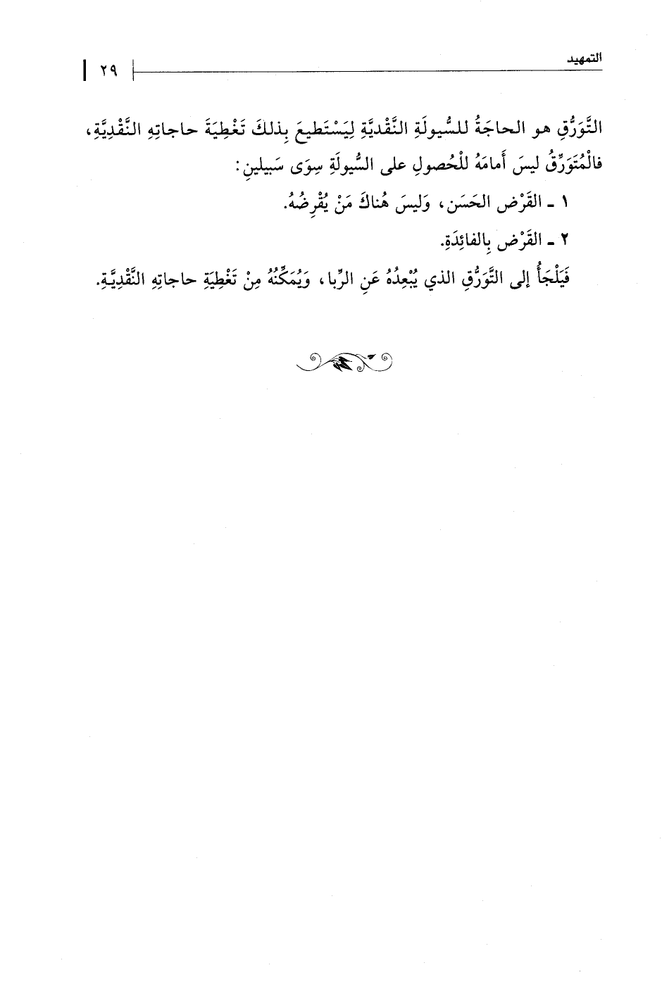 فَيَلْجَأُ إلى التَّوَرُّقِ الذي يُبْعِدُهُ عَنِ الرِّبا، وَيُمَكِّنُهُ مِنْ تَغْطِيَةِ حاجاتِهِ النَّقْدِيَّةِ.