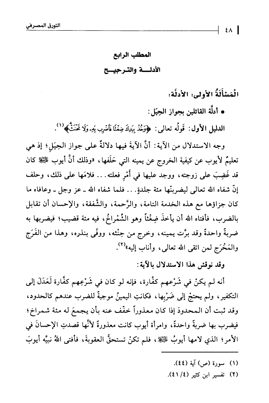 وجه الاستدلال من الآية: أنَّ الاَيةَ فيها دلالةٌ على جواز الحِيَلِ، إذ هي تعليمٌ لأيوب عن كيفية الخروج عن يمينه التي حَلَفها، "وذلك أنَ أيوب -عليه السلام- كان قد غَضِبَ على زوجته، ووجد عليها في أَمْرِ فعلته. . . فلامَها على ذلك، وحلف إنّ شفاه الله تعالى ليضربنّها مئة جلدةٍ. . . فلما شفاه الله -عز وجل- وعافاه ما كان جزاؤها مع هذه الخذمة التامة، والرَّحمة، والشَّفقة، والإحسان أن تقابل بالضرب، فأفتاه الله أن ياخذَ ضِغْثًا وهو الشِّمْراخُ، فيه مئة قضيب، فيضربها به ضربةً واحدةً وقد برَّت يمينه، وخرج من حِنْثه، ووفّى بنذره، وهذا من الفَرَج والمَخْرَج لمن اتقى الله تعالى، وأناب إليه" (¬2).