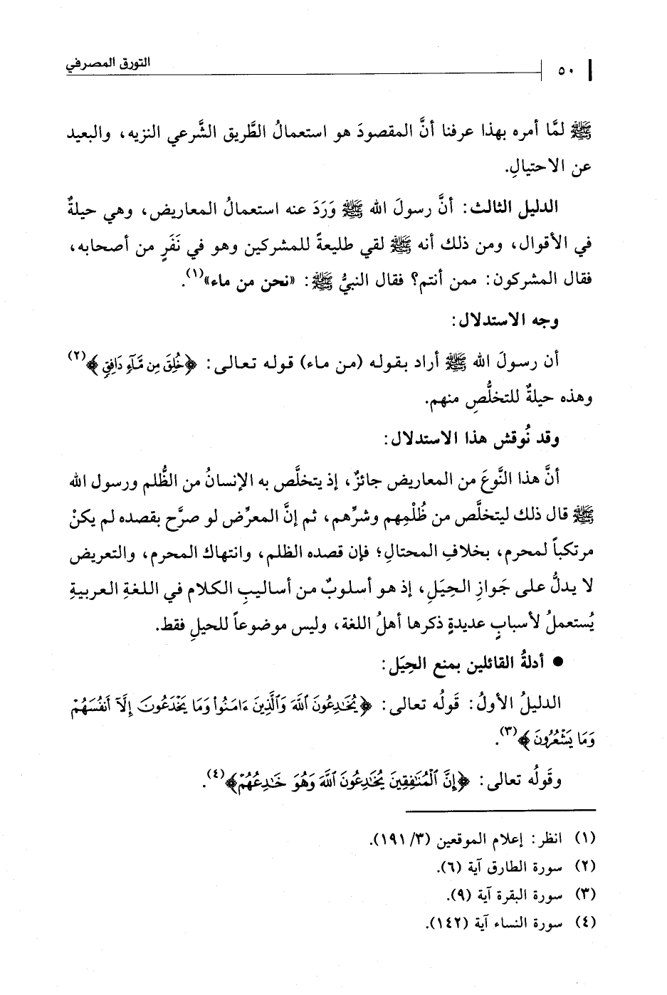 الدليل الثالث: أنَّ رسولَ الله - صلى الله عليه وسلم - وَرَدَ عنه استعمالُ المعاريض، وهي حيلةٌ في الأقوال، ومن ذلك أنه - صلى الله عليه وسلم - لقي طليعةً للمشركين وهو في نَفَرٍ من أصحابه، فقال المشركون: ممن أنتم؟ فقال النبيُّ صلى الله عليه وسلم: "نحن من ماء" (¬1).