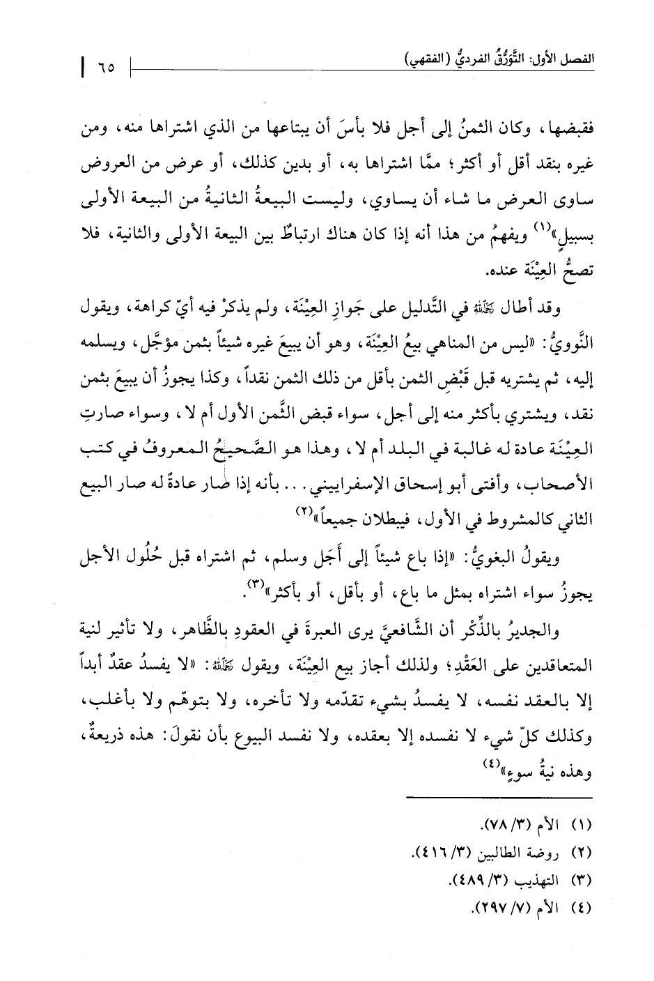 وقد أطال --رحمه الله-- في التَّدليل على جَوازِ العِيْنَة، ولم يذكرْ فيه أيّ كراهة، ويقول النَّوويُّ: "ليس من المناهي بيعُ العِيْنَة، وهو أن يبيعَ غيره شيئًا بثمن مؤجَّل، ويسلمه إليه، ثم يشتريه قبل قَبْضِ الثمن بأقل من ذلك الثمن نقدًا، وكذا يجوزُ أن يبيعَ بثمن نقد، ويشتري بأكثر منه إلى أجل، سواء قبض الثَّمن الأول أم لا، وسواء صارتِ العِيْنَة عادة له غالبة في البلد أم لا، وهذا هو الصَّحيحُ المعروفُ في كتب الأصحاب، وأفتى أبو إسحاق الإسفراييني. . . بأنه إذا صار عادةً له صار البيع الثاني كالمشروط في الأول، فيبطلان جميعًا" (¬2)