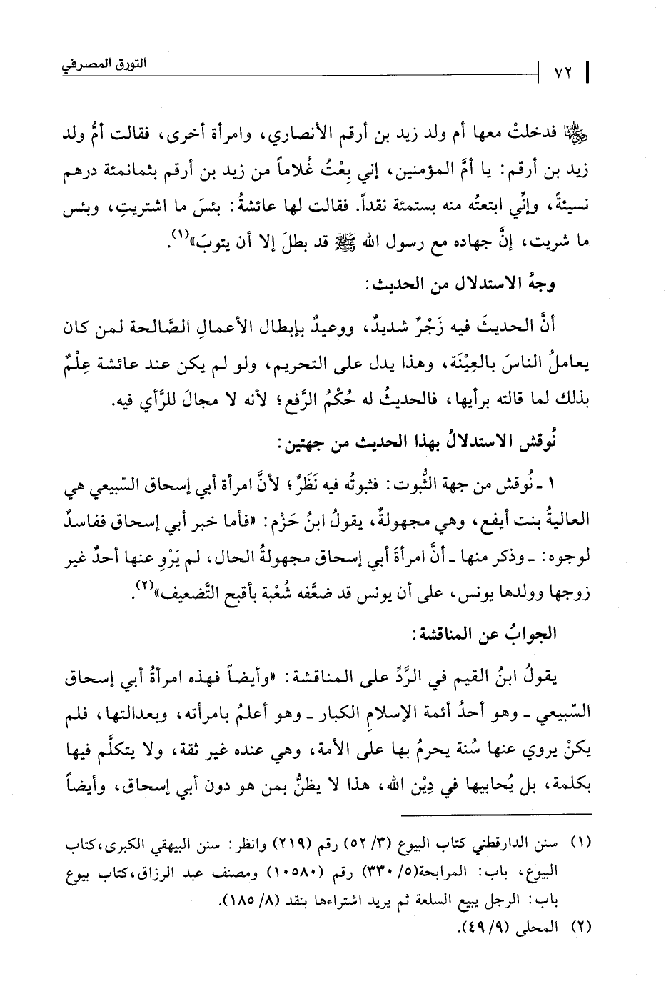 1 - نُوقش من جهة الثُّبوت: فثبوتُه فيه نَظَرٌ؛ لأنَّ امرأة أبي إسحاق السّبيعي هي العاليةُ بنت أيفع، وهي مجهولةٌ، يقولُ ابنُ حَزْم: "فأما خبر أبي إسحاق ففاسدٌ لوجوه: -وذكر منها- أنَّ امرأةَ أبي إسحاق مجهولةُ الحال، لم يَرْوِ عنها أحدٌ غير زوجها وولدها يونس، على أن يونس قد ضعَّفه شُعْبة بأقبح التَّضعيف" (¬2).