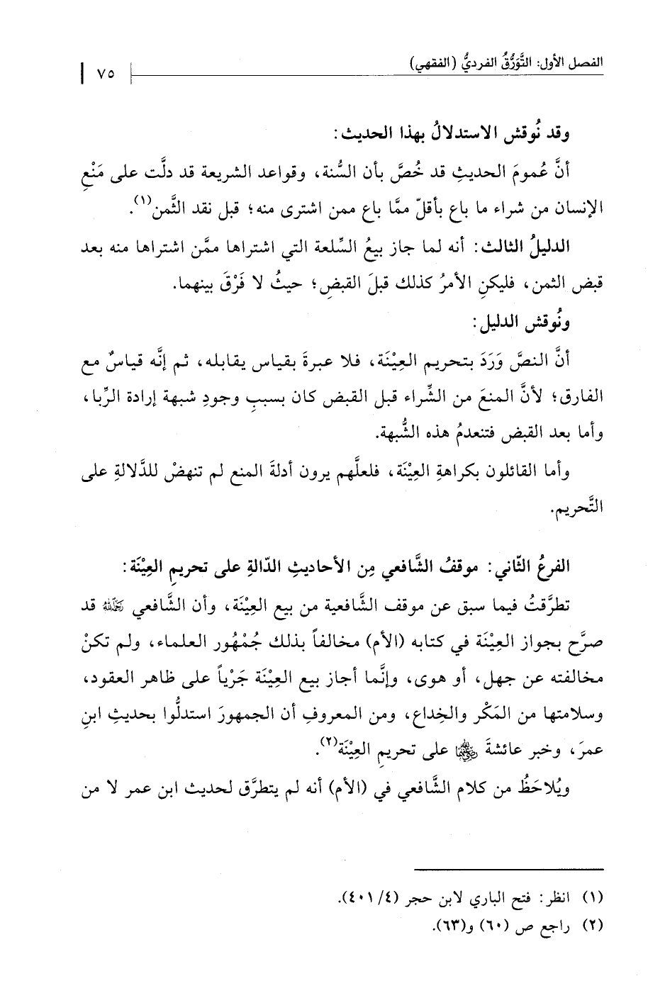 تطرَّقتُ فيما سبق عن موقف الشَّافعية من بيع العِيْنَة، وأن الشَّافعي -رحمه الله- قد صرَّح بجواز العِيْنَة في كتابه (الأم) مخالفًا بذلك جُمْهُور العلماء، ولم تكنْ مخالفته عن جهل، أو هوى، وإنَّما أجاز بيع العِيْنَة جَرْيًا على ظاهر العقود، وسلامتها من المَكْر والخِداع، ومن المعروفِ أن الجمهورَ استدلُّوا بحديثِ ابنِ عمرَ، وخبر عائشة - رضي الله عنهما - على تحريمِ العِيْنَة (¬2).