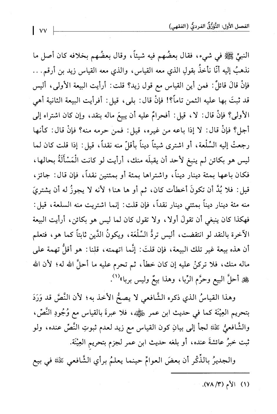 وهذا القياسُ الذي ذكره الشَّافعي لا يصحُّ الأخذ به؛ لأن النَّصَّ قد وَرَدَ بتحريم العِيْنَة كما في حديث ابن عمر - رضي الله عنه -، فلا عبرةَ بالقياس مع وُجُودِ النَّصِّ، والشَّافعيُّ -رحمه الله- لجأ إلى بيانِ كون القياس مع زيد لعدم ثبوتِ النَّصِّ عنده، ولو ثبت خبرُ عائشةَ عنده، أو بلغه حديث ابن عمر لجزم بتحريمِ العِيْنَة.