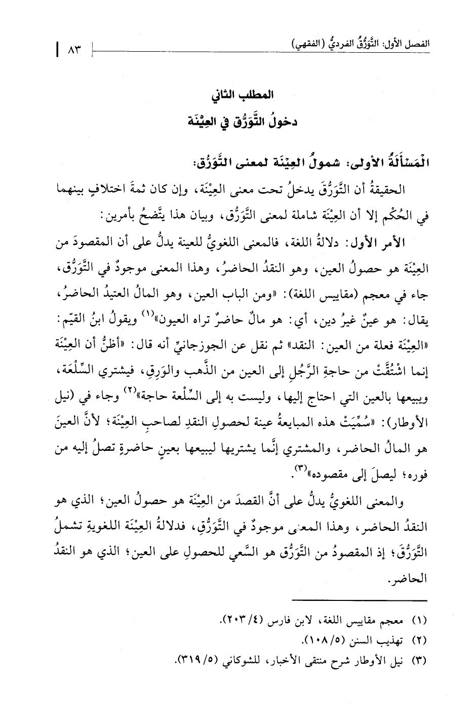الأمر الأول: دلالةُ اللغة، فالمعنى اللغويُّ للعينة يدلُّ على أن المقصودَ من العِيْنَة هو حصولُ العين، وهو النقدُ الحاضرُ، وهذا المعنى موجودٌ في التَّوَرُّق، جاء في معجم (مقاييس اللغة): "ومن الباب العين، وهو المالُ العتيدُ الحاضرُ، يقال: هو عينٌ غيرُ دين، أي: هو مالٌ حاضرٌ تراه العيون" (¬1) ويقولُ ابنُ القيّم: "العِيْنَة فعلة من العين: النقد" ثم نقل عن الجوزجانيِّ أنه قال: "أظنُّ أن العِيْنَة إنما اشْتُقَّتْ من حاجةِ الرَّجُلِ إلى العين من الذهب والوَرِقِ، فيشتري السِّلْعَة، ويبيعها بالعين التي احتاج إليها، وليست به إلى السِّلْعة حاجة" (¬2) وجاء في (نيل الأوطار): "سُمِّيَتْ هذه المبايعةُ عينة لحصولِ النقدِ لصاحبِ العِيْنَة؛ لأنَّ العينَ هو المالُ الحاضر، والمشتري إنَّما يشتريها ليبيعها بعينٍ حاضرةٍ تصلُ إليه من فوره، ليصلَ إلى مقصوده" (¬3).