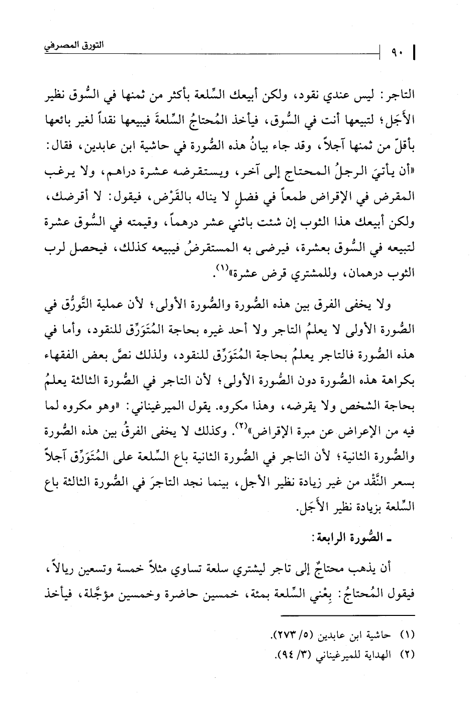 ولا يخفى الفرق بين هذه الصُّورة والصُّورة الأولى؛ لأن عملية التَّورُّق في الصُّورة الأولى لا يعلمُ التاجر ولا أحد غيره بحاجة المُتَوَرِّق للنقود، وأما في هذه الصُّورة فالتاجر يعلمُ بحاجة المُتَوَرق للنقود، ولذلك نصَّ بعض الفقهاء بكراهة هذه الصورة دون الصُّورة الأولى؛ لأن التاجر في الصُّورة الثالثة يعلمُ بحاجة الشخص ولا يقرضه، وهذا مكروه. يقول الميرغيناني: "وهو مكروه لما فيه من الإعراض عن مبرة الإقراض" (¬2). وكذلك لا يخفى الفرقُ بين هذه الصُّورة والصُّورة الثانية؛ لأن التاجر في الصُّورة الثانية باع السلعة على المُتَوَرّق آجلًا بسعر النَّقْد من غير زيادة نظير الأجل، بينما نجد التاجرَ في الصُّورة الثالثة باع السِّلعة بزيادة نظير الأَجَل.