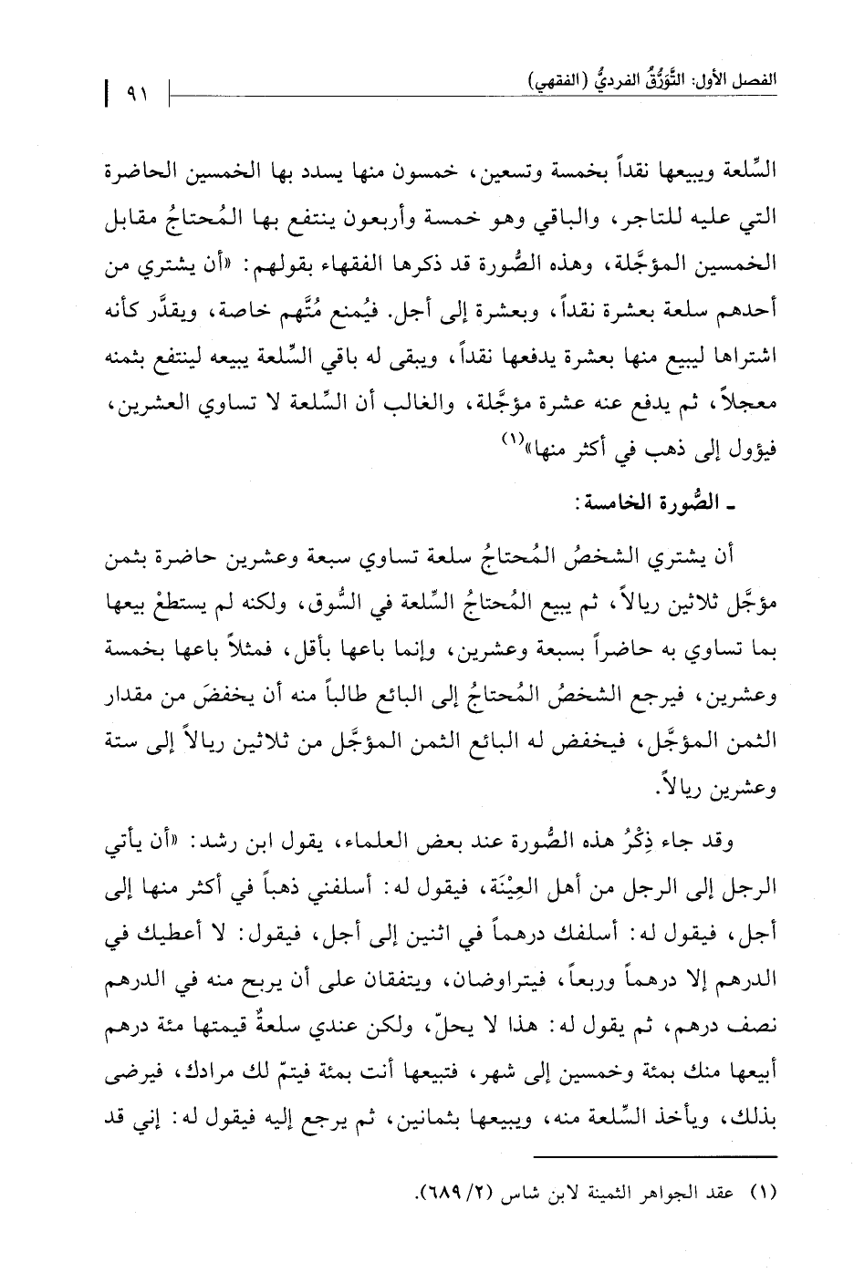 السِّلعة ويبيعها نقدًا بخمسة وتسعين، خمسون منها يسدد بها الخمسين الحاضرة التي عليه للتاجر، والباقي وهو خمسة وأربعون ينتفع بها المُحتاجُ مقابل الخمسين المؤجَّلة، وهذه الصُّورة قد ذكرها الفقهاء بقولهم: "أن يشتري من أحدهم سلعة بعشرة نقدًا، وبعشرة إلى أجل. فيُمنع مُتَّهم خاصة، ويقدَّر كأنه اشتراها ليبيع منها بعشرة يدفعها نقدًا، ويبقى له باقي السِّلعة يبيعه لينتفع بثمنه معجلًا، ثم يدفع عنه عشرة مؤجَّلة، والغالب أن السِّلعة لا تساوي العشرين، فيؤول إلى ذهب في أكثر منها" (¬1)