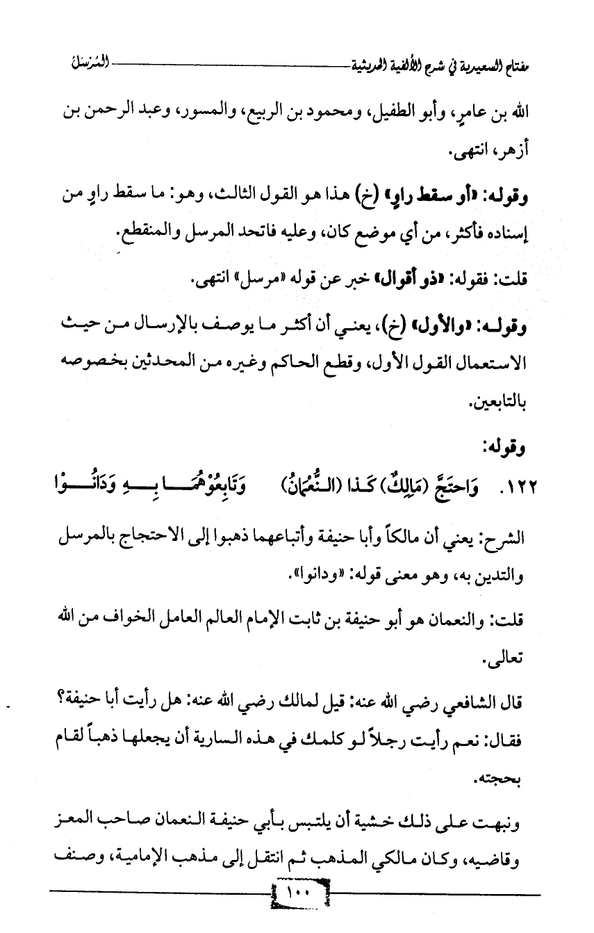 122 - وَاحتَجَّ (مَاِلِكٌ) كَذا (النُّعْمَانُ) ... وَتَابِعُوْهُمَا بِهِ وَدَانُوْا