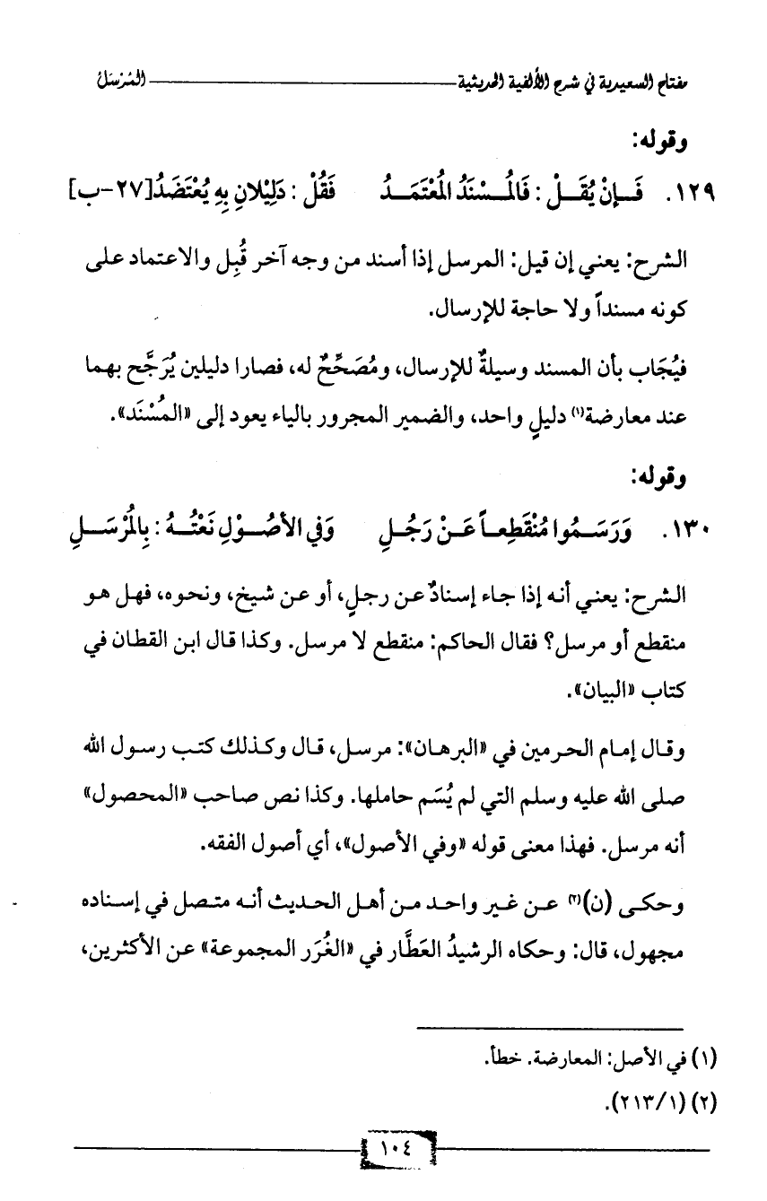 130 - وَرَسَمُوا مُنْقَطِعاً عَنْ رَجُلِ ... وَفي الأصُوْلِ نَعْتُهُ: بِالمُرْسَل