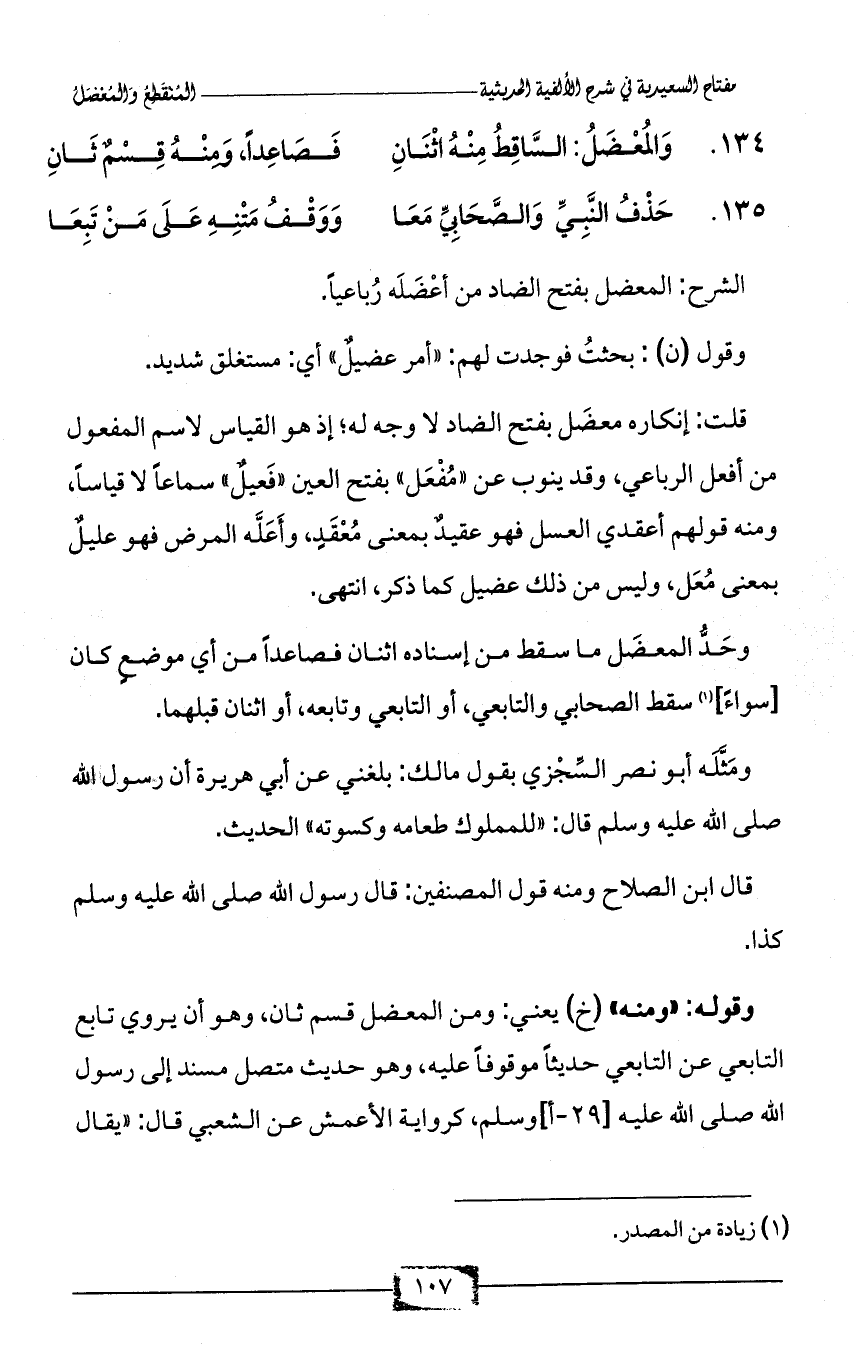 قلت: إنكاره معضَل بفتح الضاد لا وجه له؛ إذ هو القياس لاسم المفعول من أفعل الرباعي، وقد ينوب عن «مُفْعَل» بفتح العين «فَعيلٌ» سماعاً لا قياساً، ومنه قولهم أعقدي العسل فهو عقيدٌ بمعنى مُعْقَدٍ، وأَعَلَّه المرض فهو عليلٌ بمعنى مُعَل، وليس من ذلك عضيل كما ذكر، انتهى.