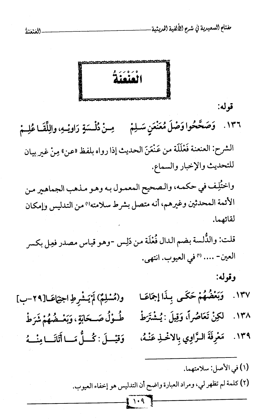 الشرح: العنعنة فَعْلَلَة من عَنْعَنَ الحديث إذا رواه بلفظ «عن» مِنْ غير بيان للتحديث والإخبار والسماع.