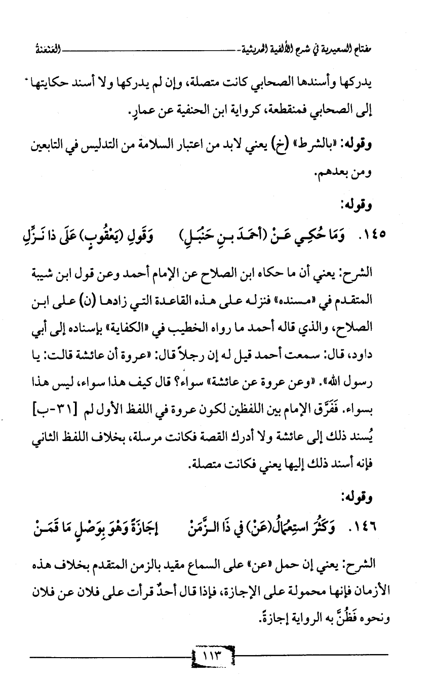 الشرح: يعني أن ما حكاه ابن الصلاح عن الإمام أحمد وعن قول ابن شيبة المتقدم في «مسنده» فنزله على هذه القاعدة التي زادها (ن) على ابن الصلاح، والذي قاله أحمد ما رواه الخطيب في «الكفاية» بإسناده إلى أبي داود، قال: سمعت أحمد قيل له إن رجلاً قال: «عروة أن عائشة قالت: يا رسول الله». «وعن عروة عن عائشة» سواء؟ قال كيف هذا سواء، ليس هذا بسواء. فَفَرَّق الإمام بين اللفظين لكون عروة في اللفظ الأول لم [31 - ب] يُسند ذلك إلى عائشة ولا أدرك القصة فكانت مرسلة، بخلاف اللفظ الثاني فإنه أسند ذلك إليها يعني فكانت متصلة.