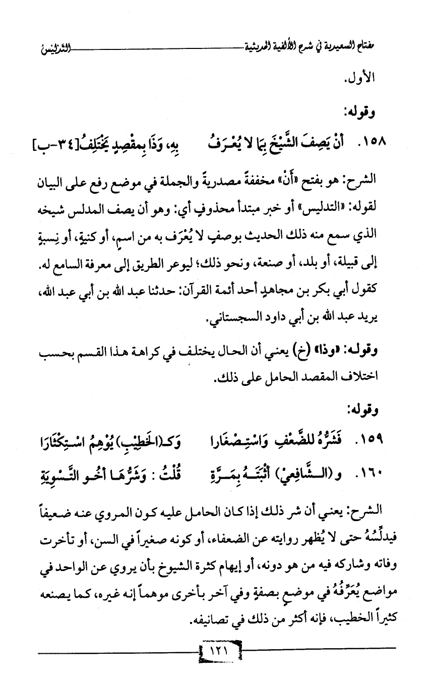 158 - أنْ يَصِفَ الشَّيْخَ بِمَا لا يُعْرَفُ ... بِهِ، وَذَا بِمقْصِدٍ يَخْتَلِفُ [34 - ب]