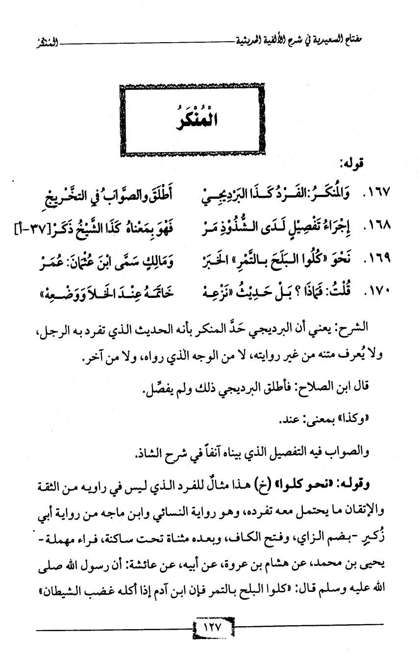 الشرح: يعني أن البرديجي حَدَّ المنكر بأنه الحديث الذي تفرد به الرجل، ولا يُعرف متنه من غير روايته، لا من الوجه الذي رواه، ولا من آخر.