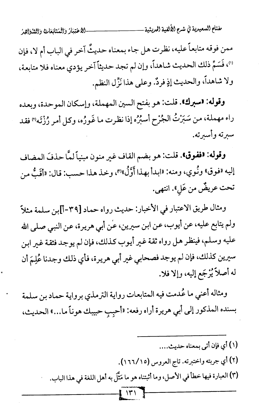 ومثال طريق الاعتبار في الأخبار: حديث رواه حماد [39 - أ] بن سلمة مثلاً ولم يتابع عليه، عن أيوب، عن ابن سيرين، عن أبي هريرة، عن النبي صلى الله عليه وسلم، فينظر هل رواه ثقة غير أيوب كذلك، فإن لم يوجد فثقة غير ابن سيرين كذلك، فإن لم يوجد فصحابي غير أبي هريرة، فأي ذلك وجدنا عُلِمَ أن له أصلاً يُرْجَع إليه، وإلا فلا.