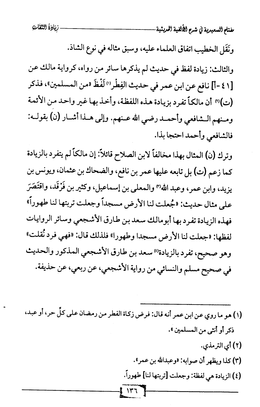 والثالث: زيادة لفظ في حديث لم يذكرها سائر من رواه، كرواية مالك عن [41 - أ] نافع عن ابن عمر في حديث الفِطْر (¬1) لَفْظَ «من المسلمين»، فذكر (ت) (¬2) أن مالكاً تفرد بزيادة هذه اللفظة، وأخذ بها غير واحد من الأئمة ومنهم الشافعي وأحمد رضي الله عنهم. وإلى هذا أشار (ن) بقوله: فالشافعي وأحمد احتجا بذا.