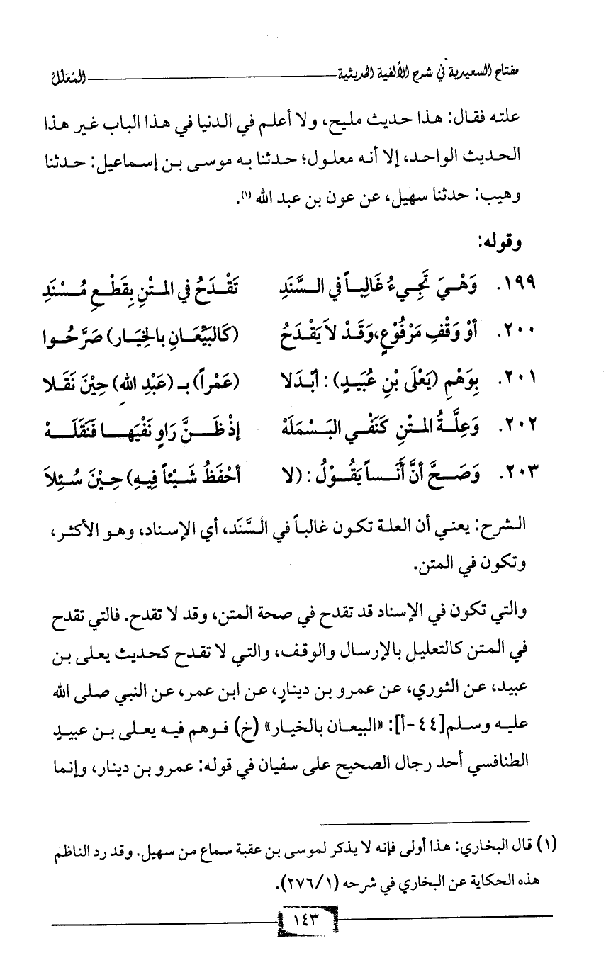 (¬1) قال البخاري: هذا أولى فإنه لا يذكر لموسى بن عقبة سماع من سهيل. وقد رد الناظم هذه الحكاية عن البخاري في شرحه (1/ 276).