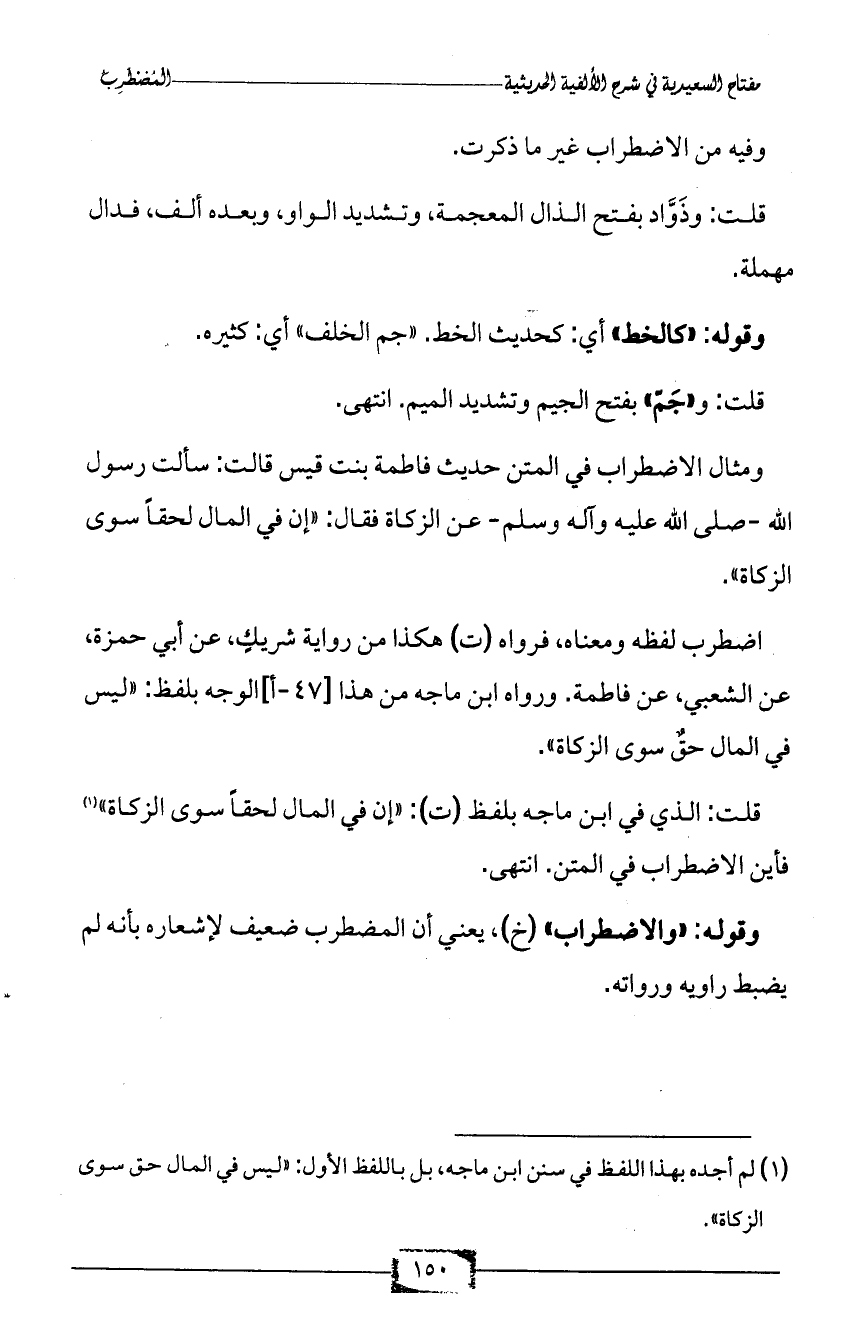 ومثال الاضطراب في المتن حديث فاطمة بنت قيس قالت: سألت رسول الله -صلى الله عليه وآله وسلم- عن الزكاة فقال: «إن في المال لحقاً سوى الزكاة».