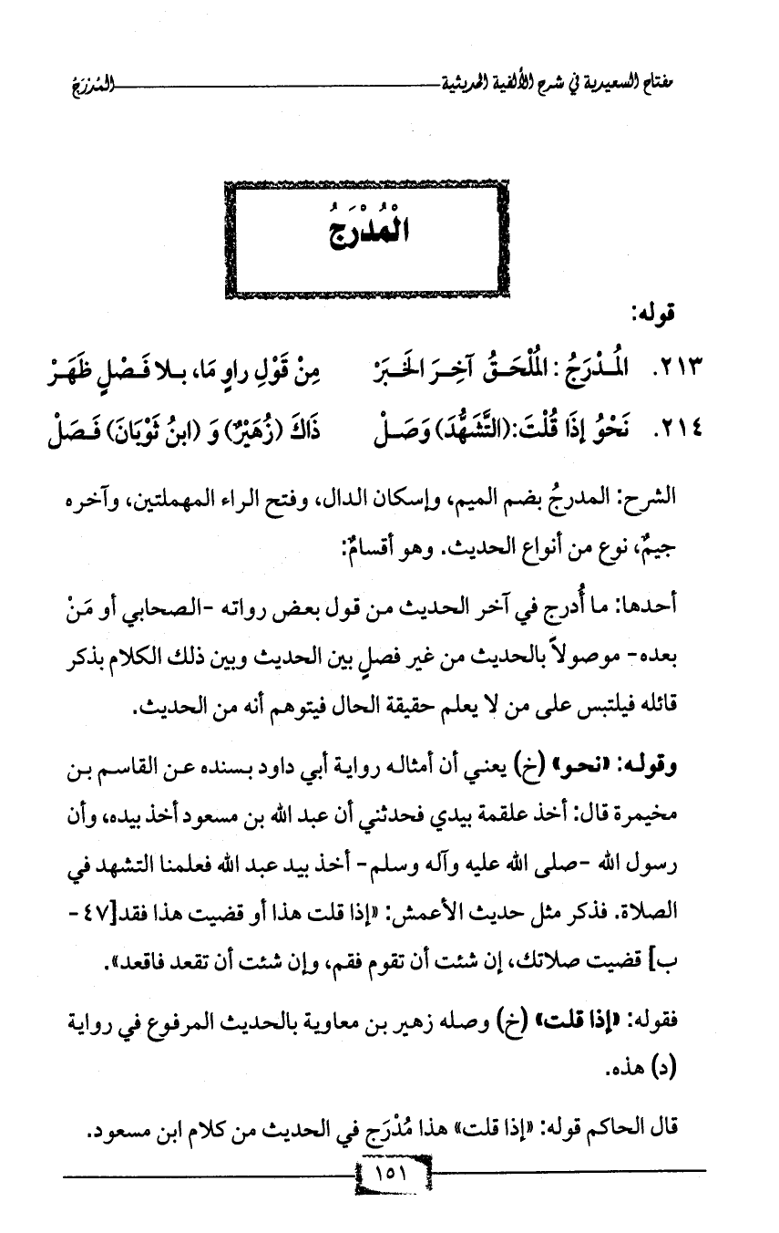 الشرح: المدرجُ بضم الميم، وإسكان الدال، وفتح الراء المهملتين، وآخره جيمٌ، نوع من أنواع الحديث. وهو أقسامٌ: