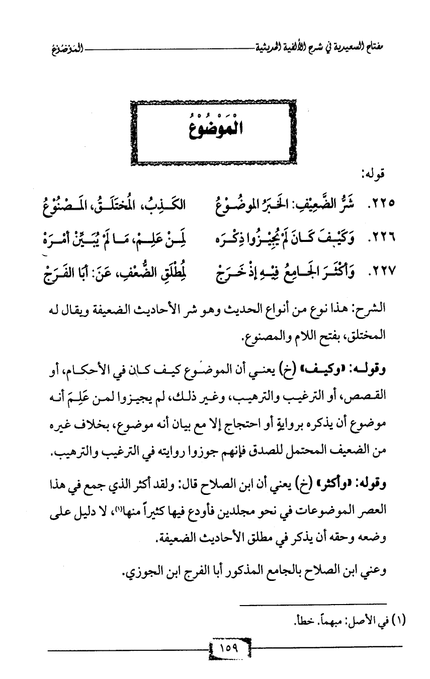 وقوله: «وكيف» (خ) يعني أن الموضوع كيف كان في الأحكام، أو القصص، أو الترغيب والترهيب، وغير ذلك، لم يجيزوا لمن عَلِمَ أنه موضوع أن يذكره بروايةٍ أو احتجاج إلا مع بيان أنه موضوع، بخلاف غيره من الضعيف المحتمل للصدق فإنهم جوزوا روايته في الترغيب والترهيب.
