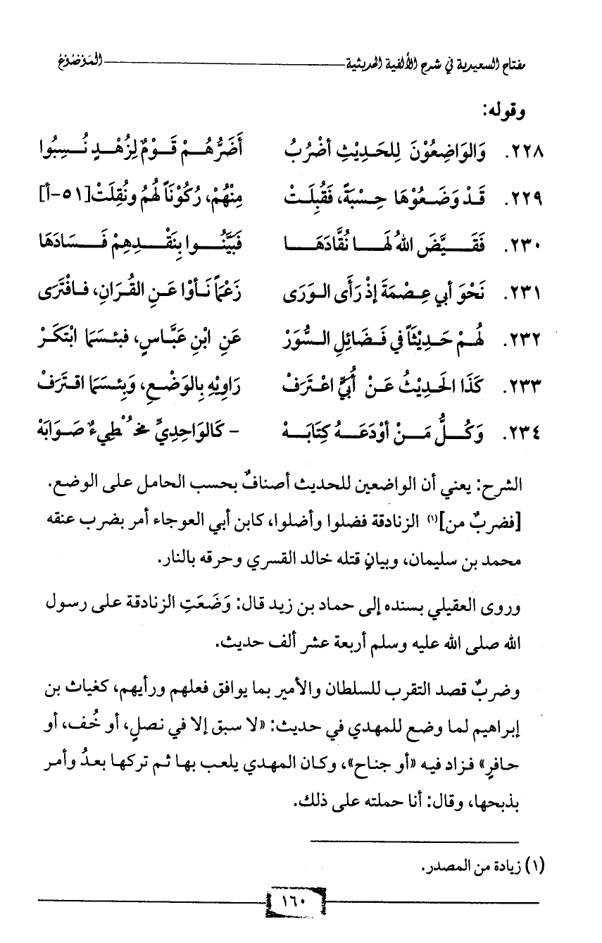 الشرح: يعني أن الواضعين للحديث أصنافٌ بحسب الحامل على الوضع. [فضربٌ من] (¬1) الزنادقة فضلوا وأضلوا، كابن أبي العوجاء أمر بضرب عنقه محمد بن سليمان، وبيانٍ قتله خالد القسري وحرقه بالنار.