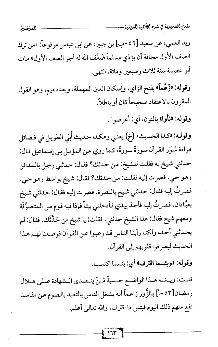 وقوله: «كذا الحديث» (خ) يعني وهكذا حديث أُبَي الطويل في فضائل قراءة سُوَر القرآن سورةً سورةً، كما روي عن المؤمل بن إسماعيل قال: حدثني شيخ به فقلت للشيخ: من حدثك؟ فقال: حدثني رجل بالمدائن وهو حي. فصرت إليه فقلت: من حدثك؟ فقال: شيخ بواسط وهو حي. فصرتُ إليه فقال: حدثني شيخ بالبصرة. فصرت إليه فقال: حدثني شيخ بعبَّادان. فصرتُ إليه فأخذ بيدي فأدخلني بيتاً فإذا فيه قوم من المتصوِّفَة ومعهم شيخ فقال: هذا الشيخ حدثني. فقلت: يا شيخ من حَدَّثَك. فقال: لم يحدثني أحد، ولكنا رأينا الناس قد رغبوا عن القرآن فوضعنا لهم هذا الحديث ليصرفوا قلوبهم إلى القرآن.