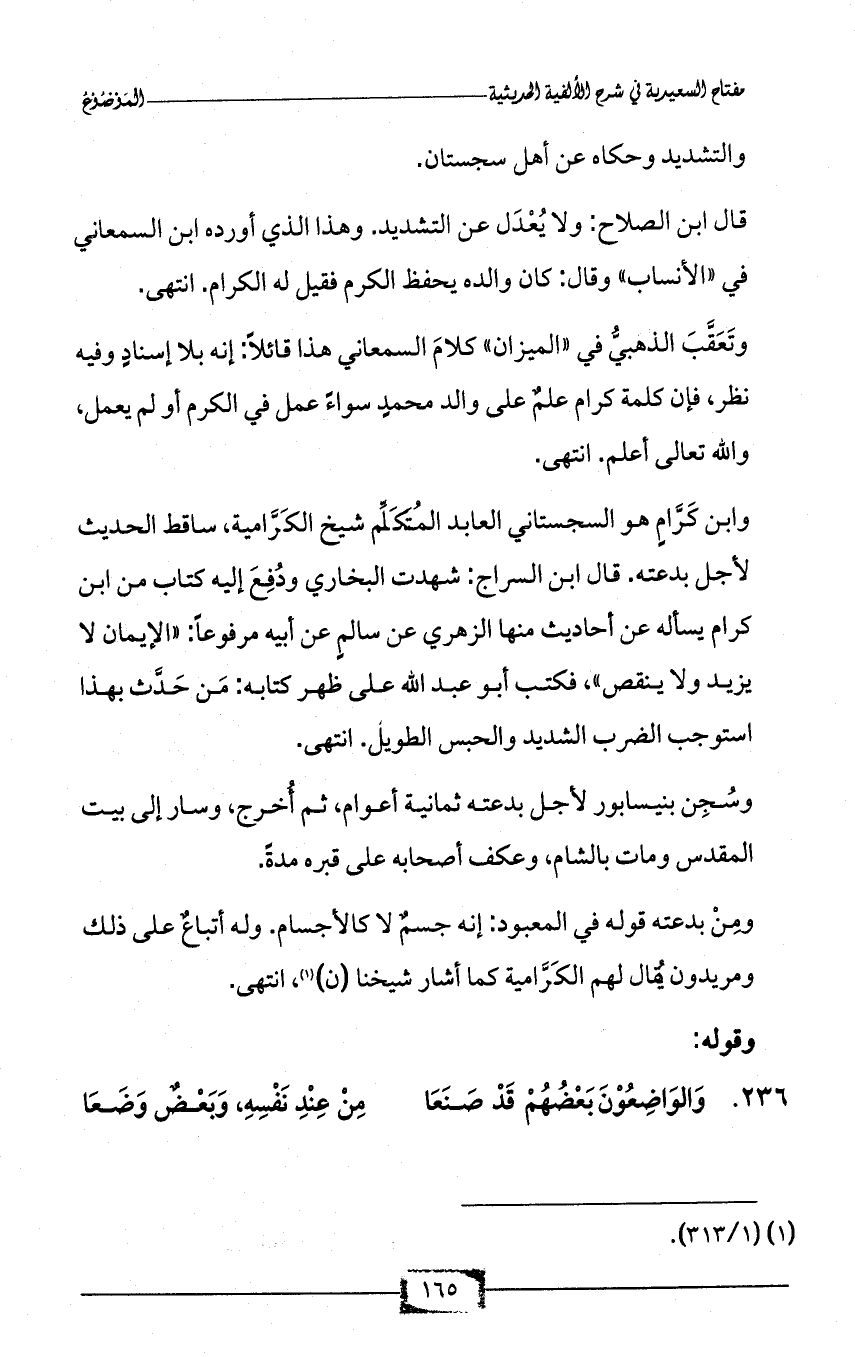 وابن كَرَّامٍ هو السجستاني العابد المُتَكَلِّم شيخ الكَرَّامية، ساقط الحديث لأجل بدعته. قال ابن السراج: شهدت البخاري ودُفِعَ إليه كتاب من ابن كرام يسأله عن أحاديث منها الزهري عن سالمٍ عن أبيه مرفوعاً: «الإيمان لا يزيد ولا ينقص»، فكتب أبو عبد الله على ظهر كتابه: مَن حَدَّث بهذا استوجب الضرب الشديد والحبس الطويل. انتهى.