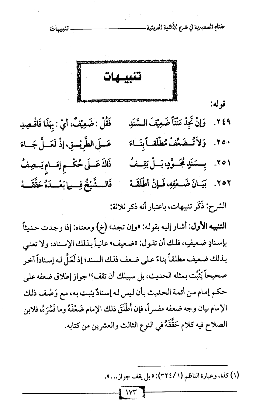 التنبيه الأول: أشار إليه بقوله: «وإن تجد» (خ) ومعناه: إذا وجدت حديثاً بإسنادٍ ضعيفٍ، فلك أن تقول: «ضعيف» عانياً بذلك الإسناد، ولا تعني بذلك ضعيف مطلقاً بناءً على ضعف ذلك السند؛ إذ لَعَلَّ له إسناداً آخر صحيحاً يَثْبُت بمثله الحديث، بل سبيلك أن تقف (¬1) جواز إطلاق ضعفه على حكم إمام من أئمة الحديث بأن ليس له إسنادٌ يثبت به، مع وَصْف ذلك الإمام بيان وجه ضعفه مفسراً، فإن أَطْلَقَ ذلك الإمام ضَعْفَهُ وما فَسَّرَهُ، فلابن الصلاح فيه كلام حَقَّقَهُ في النوع الثالث والعشرين من كتابه.