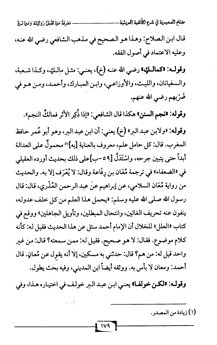 وقوله: «ولابن عبد البر» (خ) يعني: أن ابن عبد البر، وهو أبو عُمر حافظ المغرب. قال: كل حامل علم، معروف بالعناية [به] (¬1) محمولٌ على العدالة أبداً حتى يتبين جرحه، واسْتَدَلَّ [59 - ب] على ذلك بحديث أورده العقيلي في «الضعفاء» في ترجمة مُعَان بن رِفَاعة وقال: لا يُعْرَف إلا به. والحديث من رواية مُعَان السلامي، عن إبراهيم عن عبد الرحمن العُذْري، قال: قال رسول الله صلى الله عليه وسلم: «يحمل هذا العلم من كل خلف عدوله، ينفون عنه تحريف الغالين، وانتحال المبطلين، وتأويل الجاهلين» ووقع في كتاب «العلل» للخلال أن الإمام أحمد سئل عن هذا الحديث فقيل له: كأنه كلام موضوع. فقال: لا هو صحيح. فقيل له: ممن سمعته؟ قال: من غير واحد قيل له: من هم؟ قال: حدثني به مسكين، إلا أنه يقول عن مُعانٍ. قال أحمد: ومعان لا بأس به. ووثقه أيضاً ابن المديني، وفيه بحث يطول.