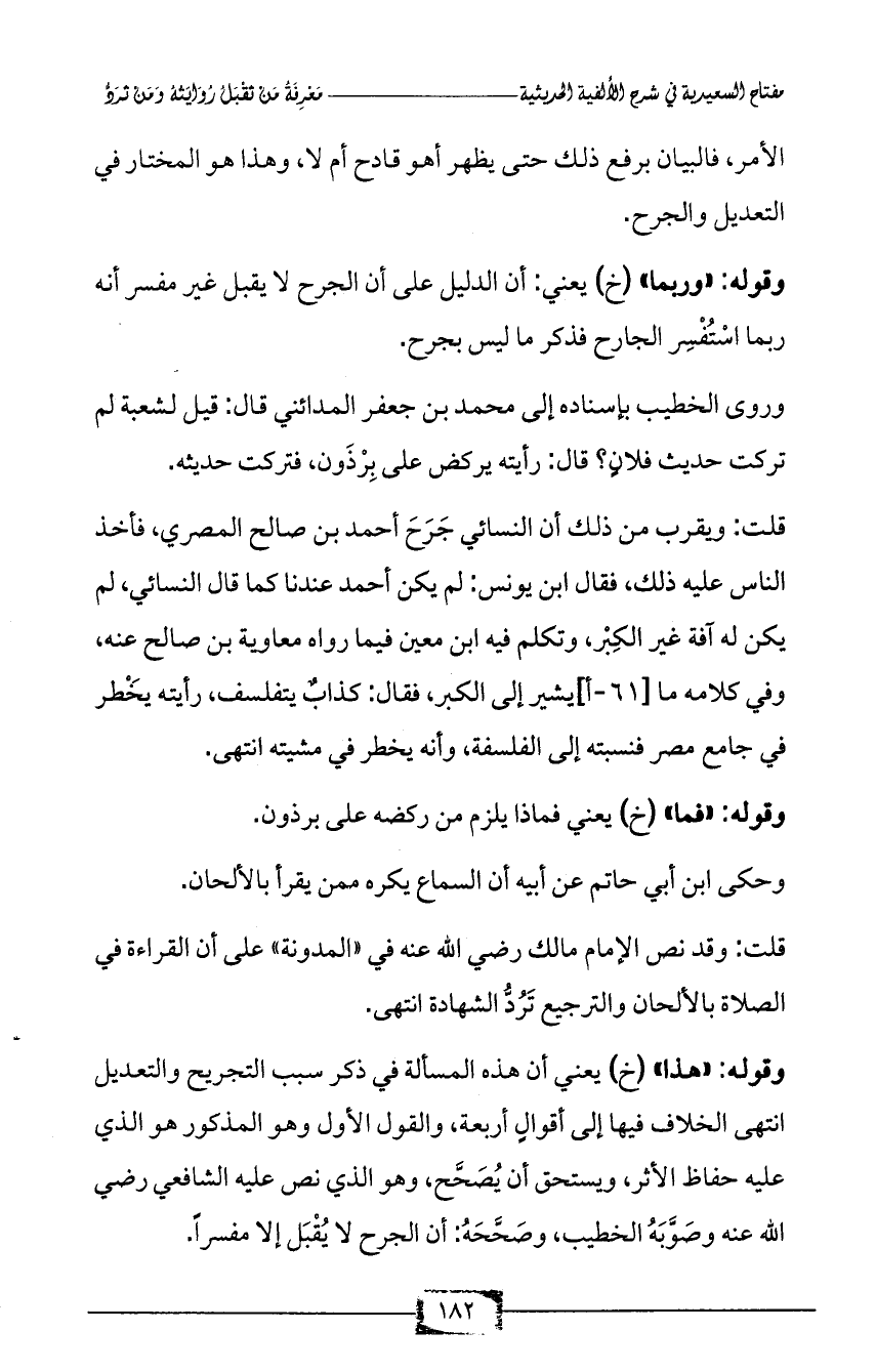 وقوله: «هذا» (خ) يعني أن هذه المسألة في ذكر سبب التجريح والتعديل انتهى الخلاف فيها إلى أقوالٍ أربعة، والقول الأول وهو المذكور هو الذي عليه حفاظ الأثر، ويستحق أن يُصَحَّح، وهو الذي نص عليه الشافعي رضي الله عنه وصَوَّبَهُ الخطيب، وصَحَّحَهُ: أن الجرح لا يُقْبَل إلا مفسراً.